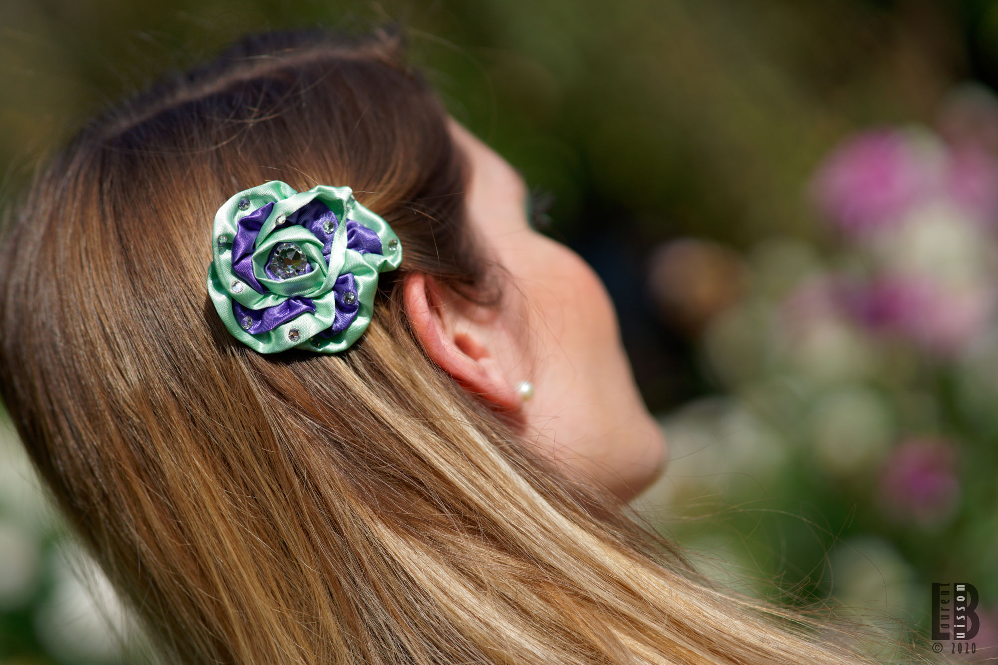 Accessoire cheveux fleur Made in France rose pour cheveux en satin vert violet et strass