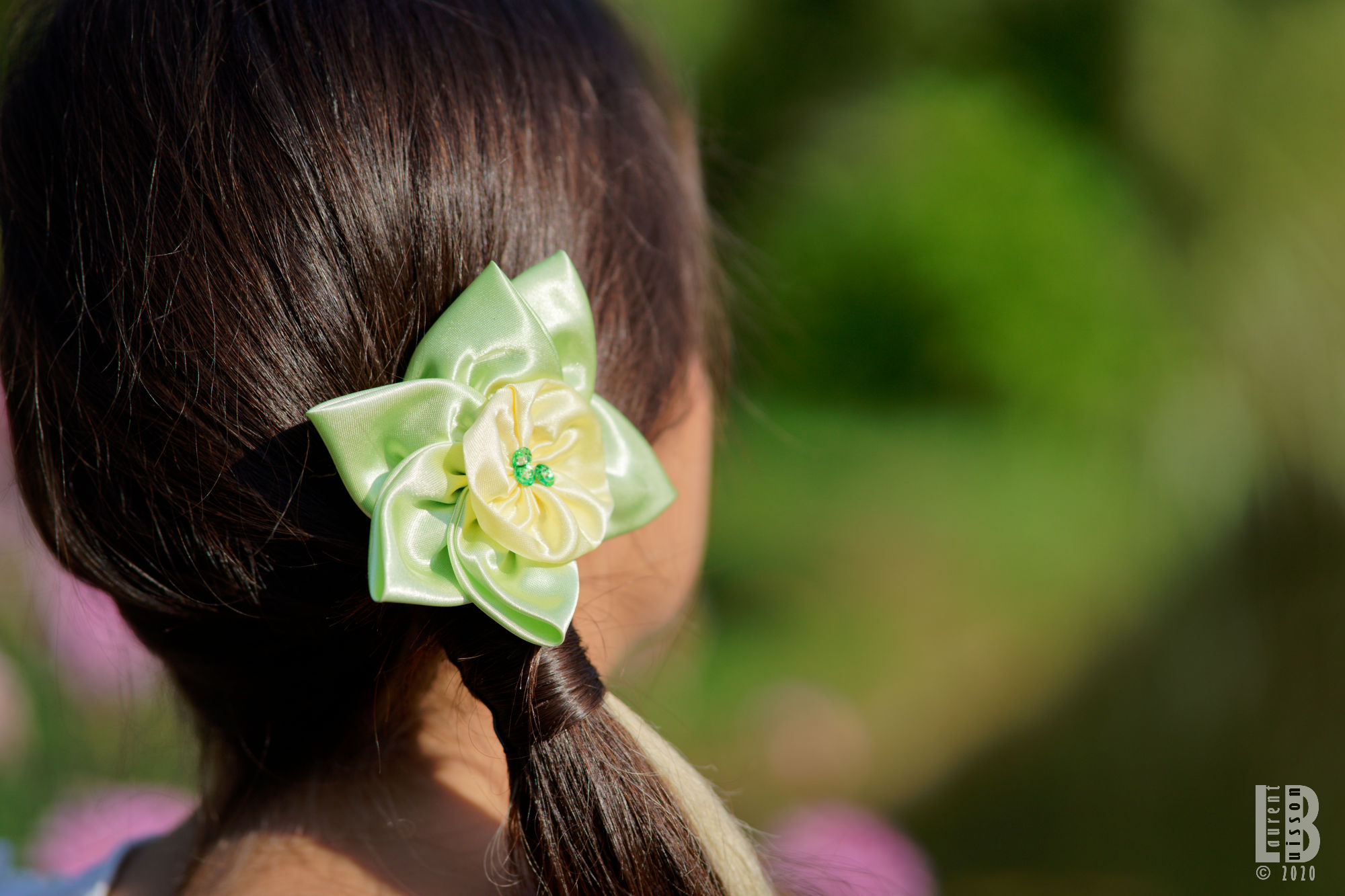 Accessoire pour cheveux Made in France en forme de fleur faite main en satin jaune et vert pâle