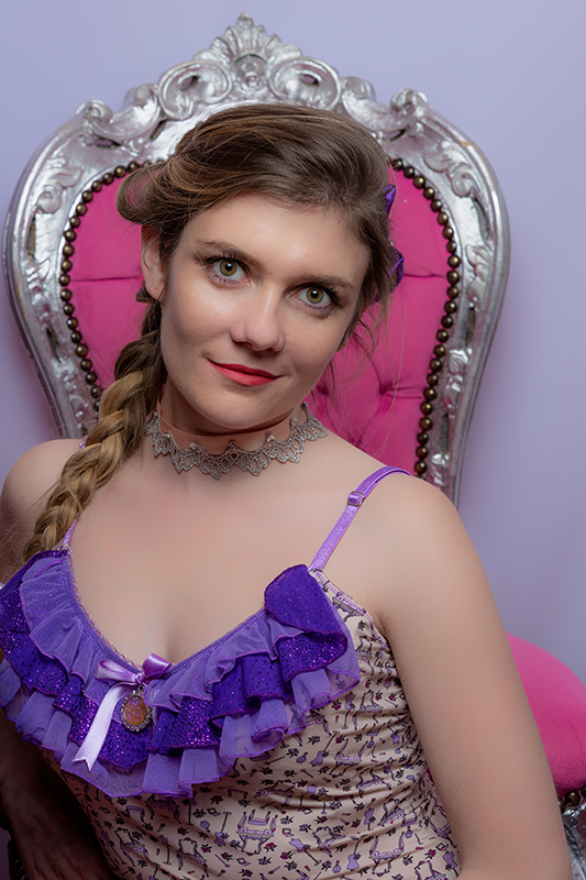 Inspiré des multiples frous-frous des robes des courtisanes du XIXème siècle, le débardeur Made in France à fines bretelles Cocotte est un haut estival pour femme, en polyamide/élasthanne imprimé et résille polyamide/élasthanne mauve et violette pailletée et encolure en V orné de trois petits volants surmontés d’un noeud en satin garni en son coeur d’un médaillon fantaisie.