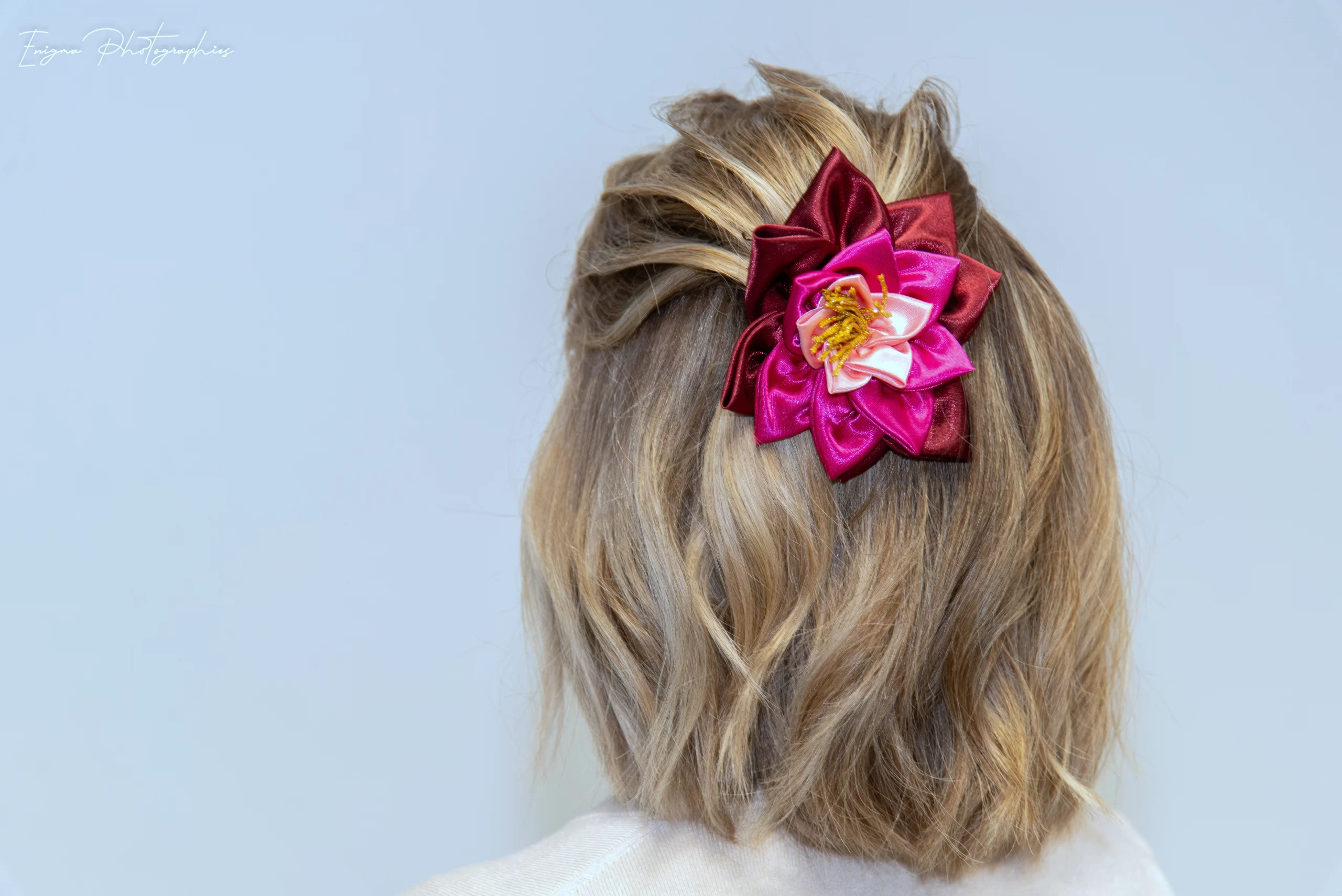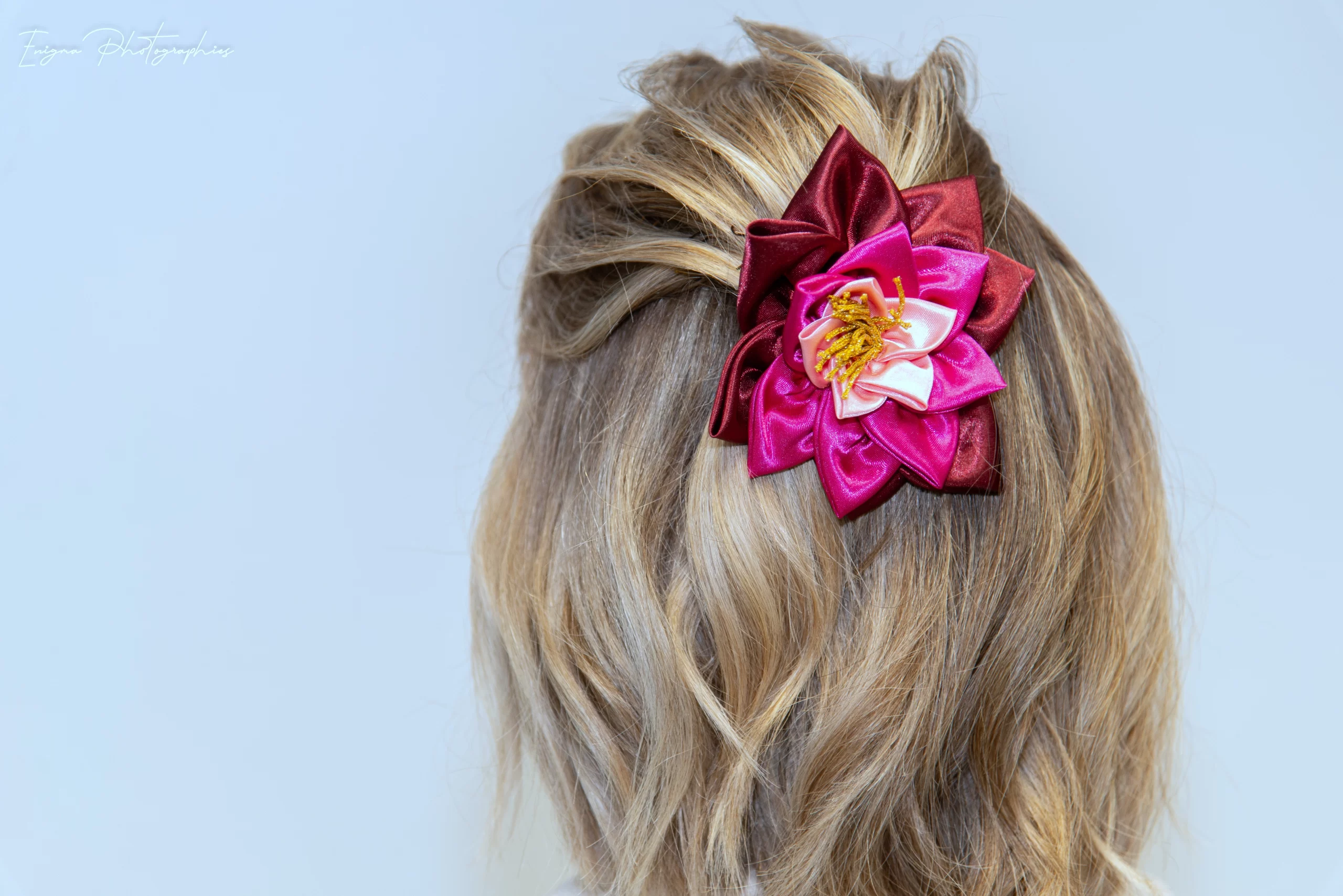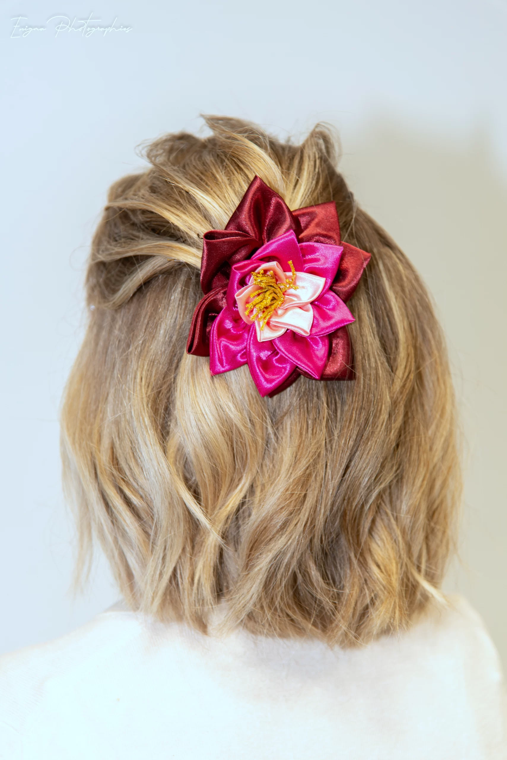 Cette somptueuse fleur pour cheveux entièrement réalisée à la main, en forme de nénuphar en satin polyester rose pâle, rose vif et bordeaux montée sur barrette ornera votre coiffure de façon originale et très élégante.