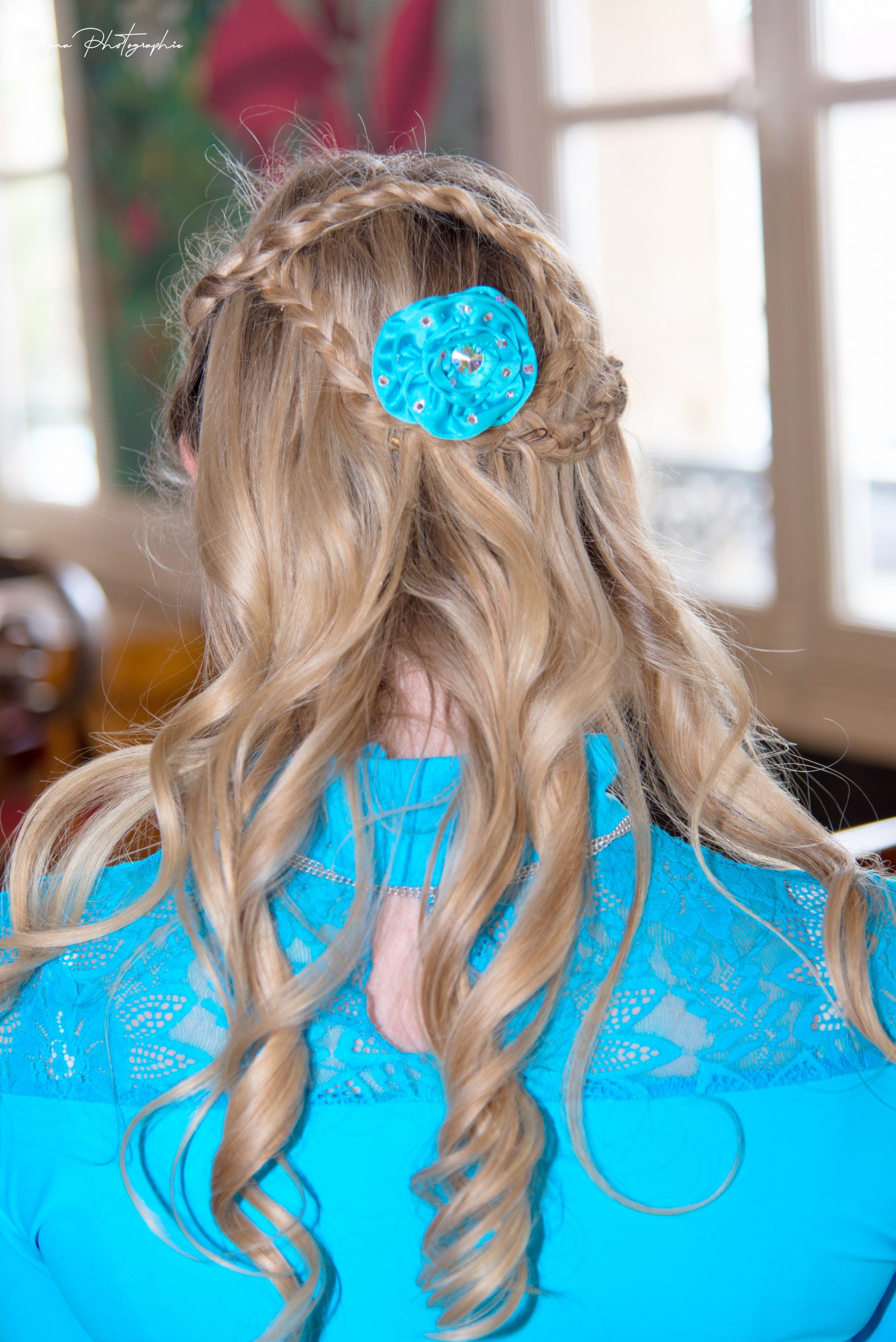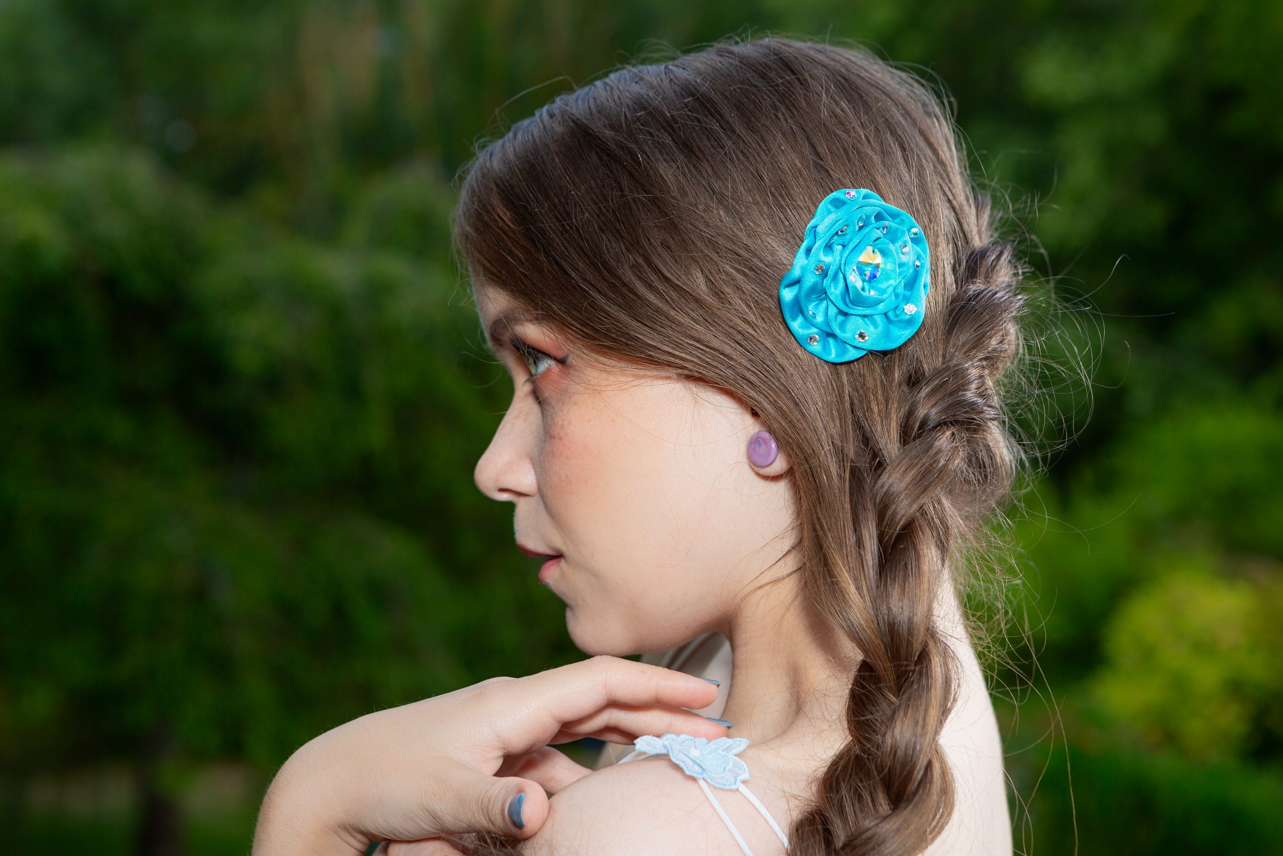 Fleur Haute Couture Made in France pour cheveux en satin turquoise à strass argentés Rosée de Cristal