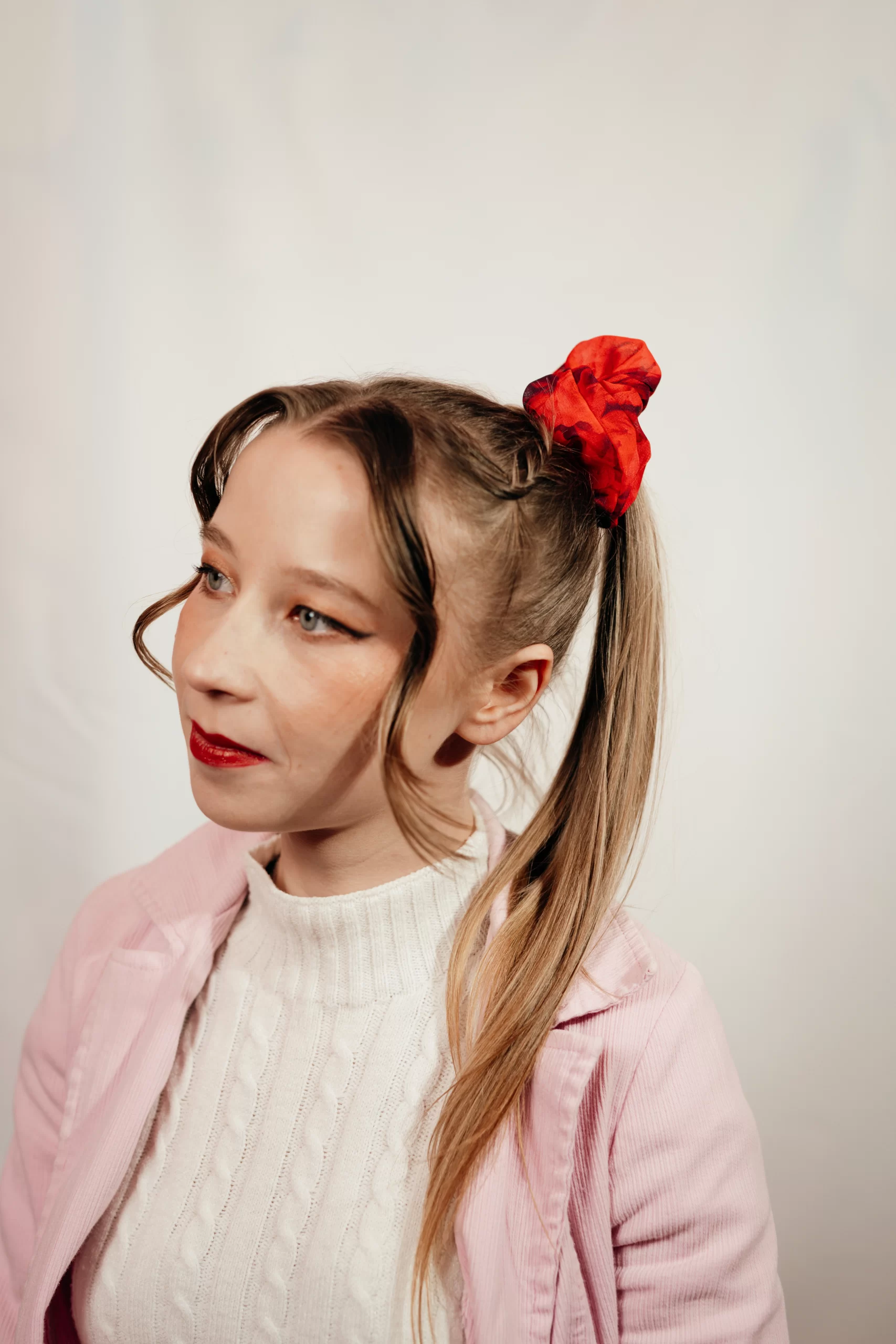 Grand chouchou Made in France pour cheveux en mousseline rouge imprimée roses rouges Déclaration d’Amour