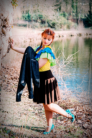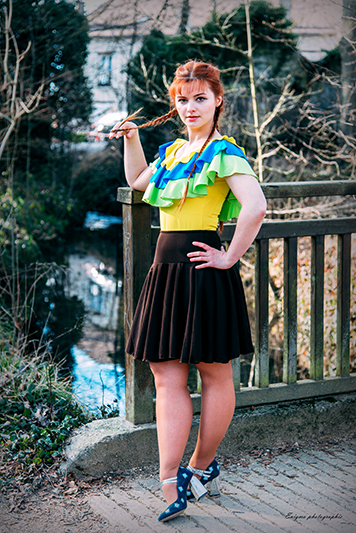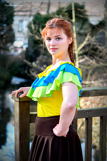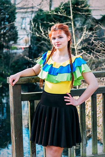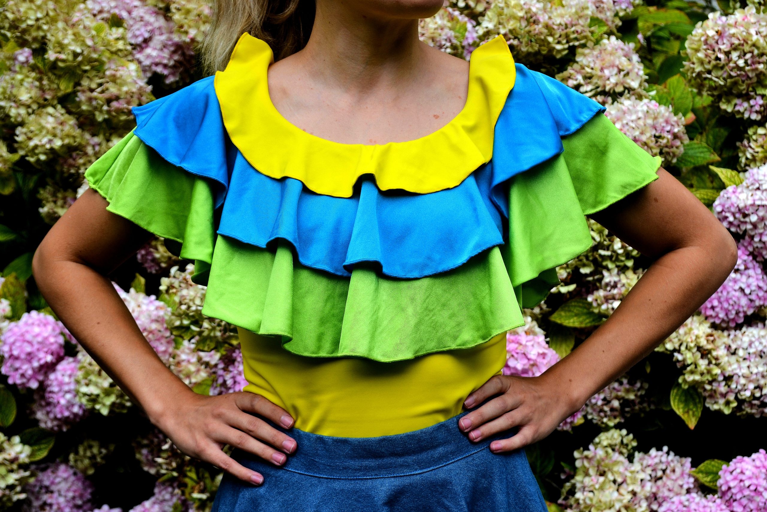 Musette est un pimpant haut tricolore pour femme, en lycra polyamide/élasthanne uni jaune, turquoise et vert, à trois volants, sans manches, encolure danseuse devant et dos.