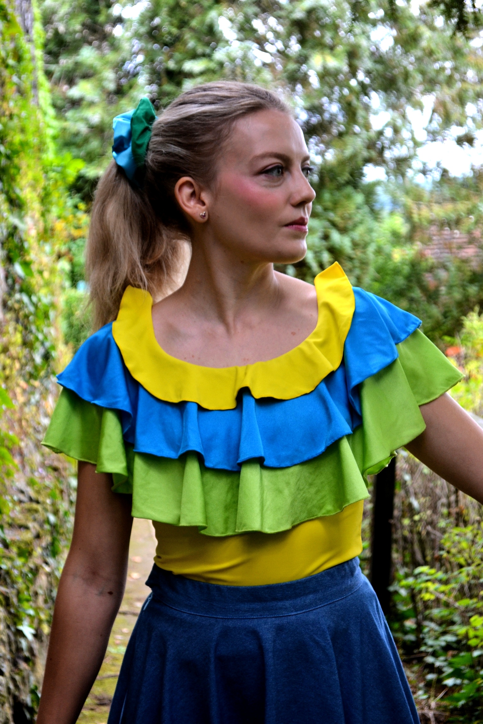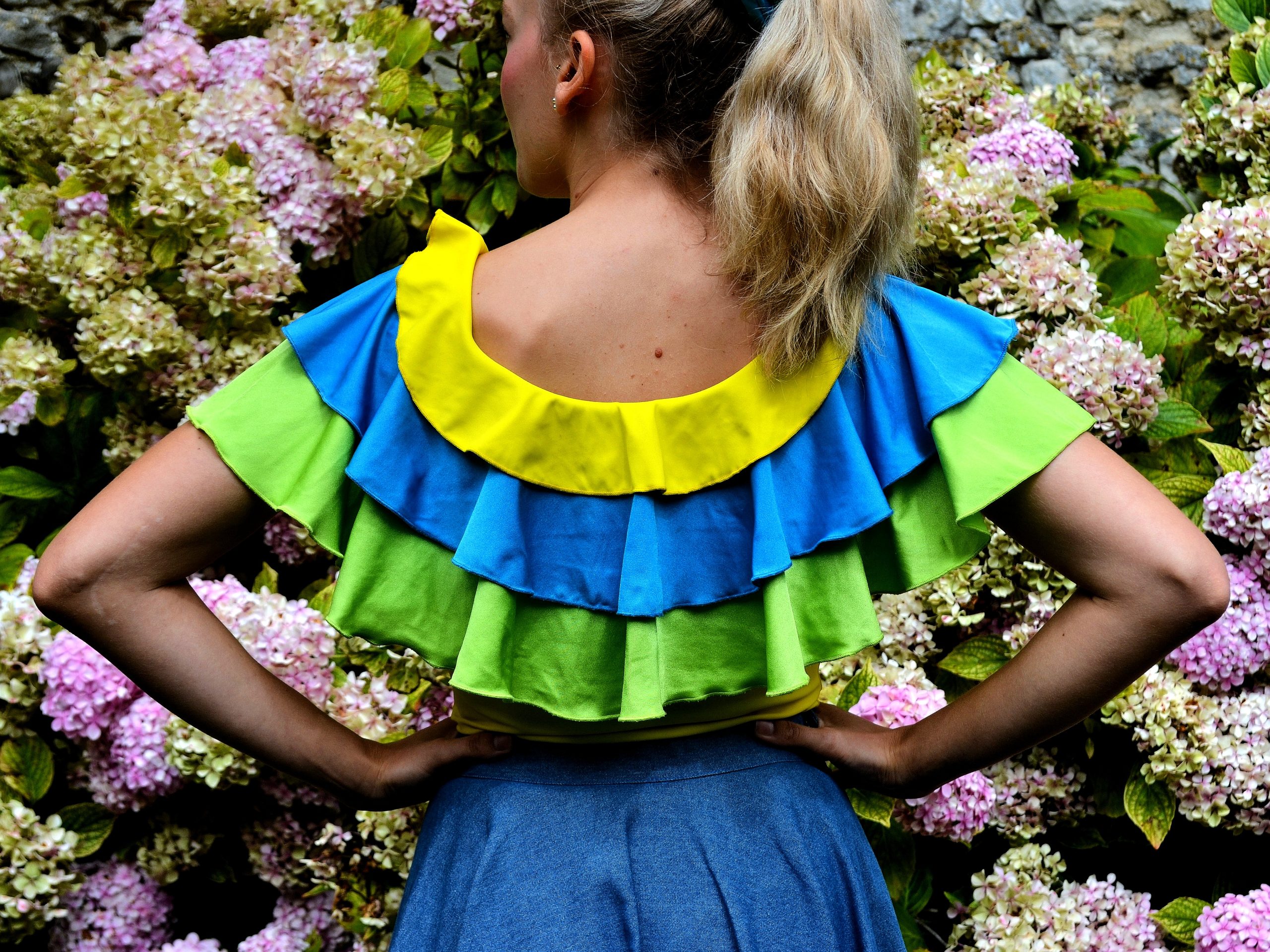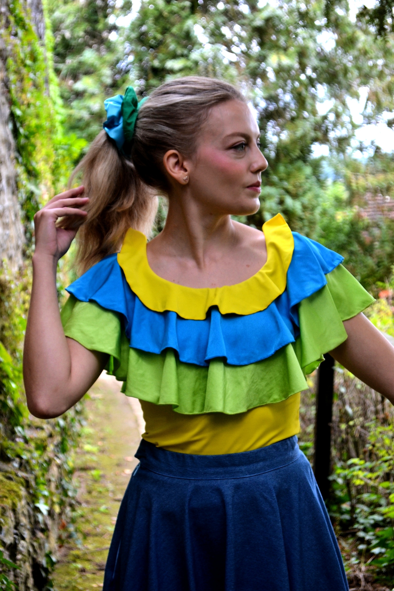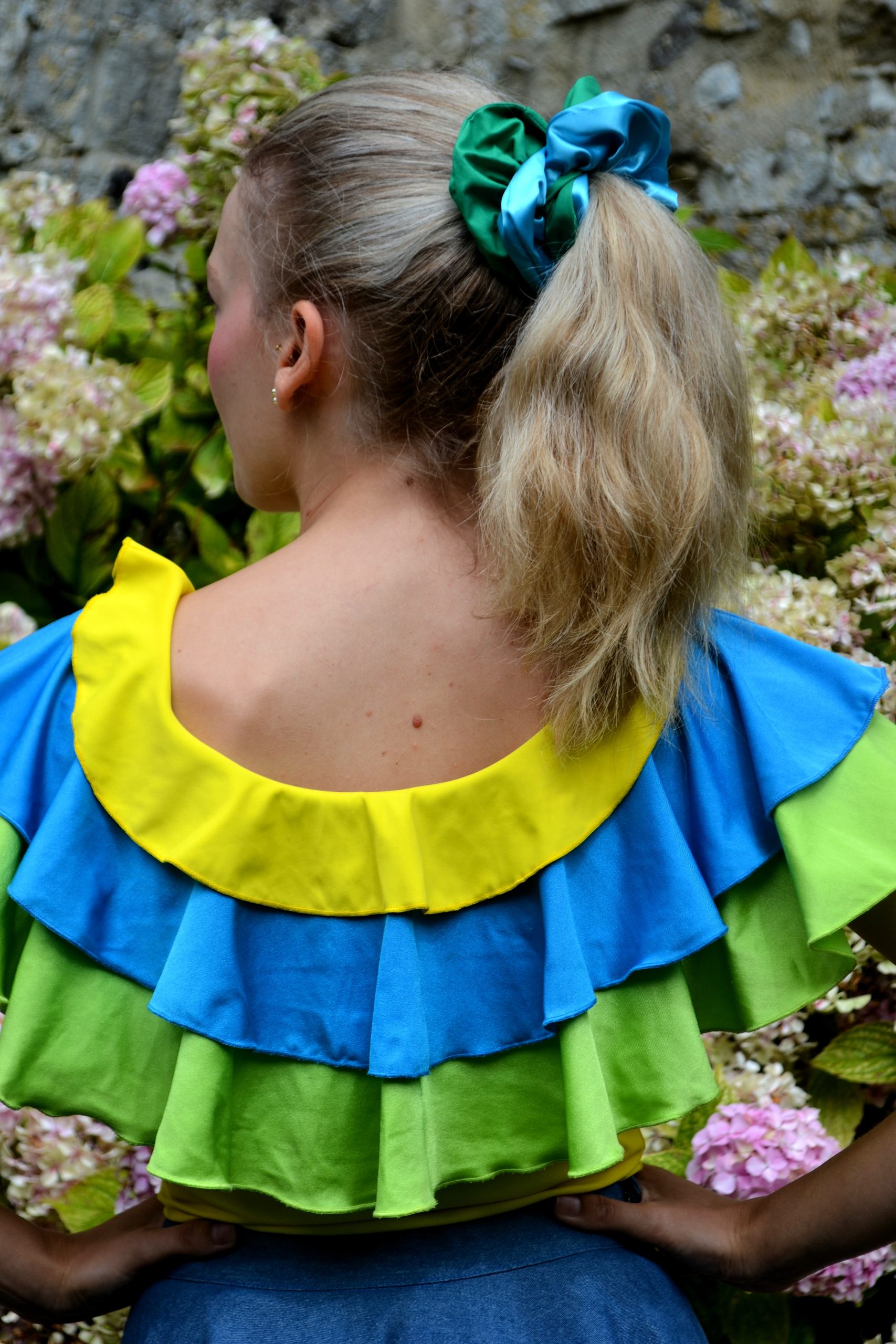 Haut pour femme tricolore à volants jaune bleu et vert