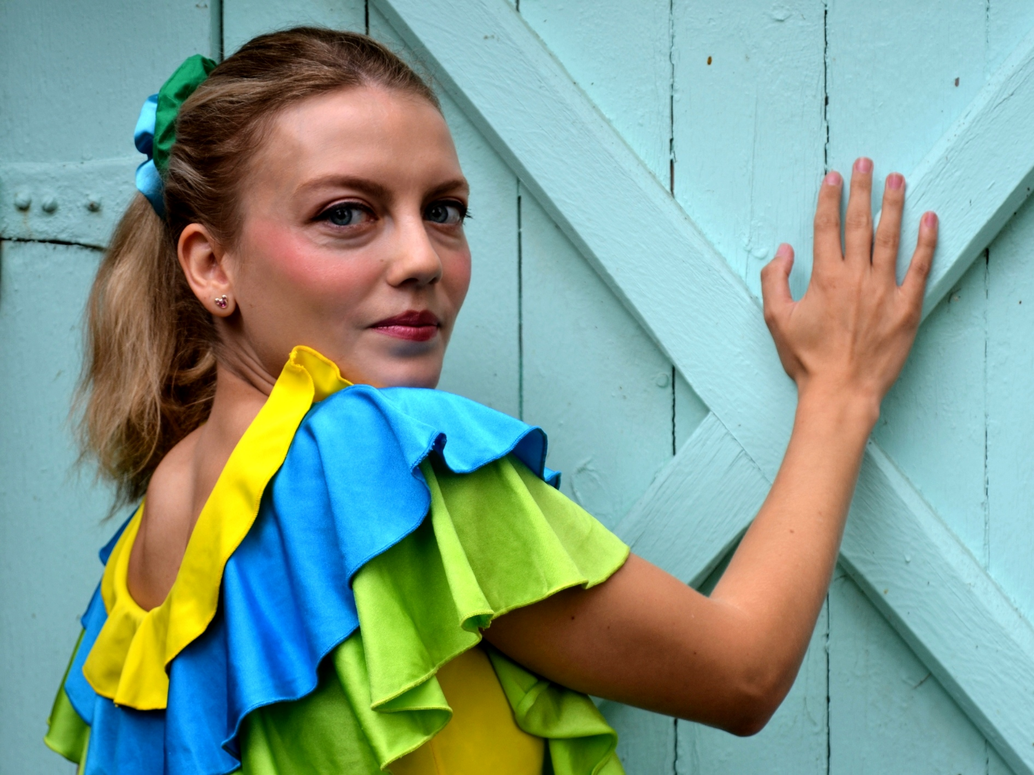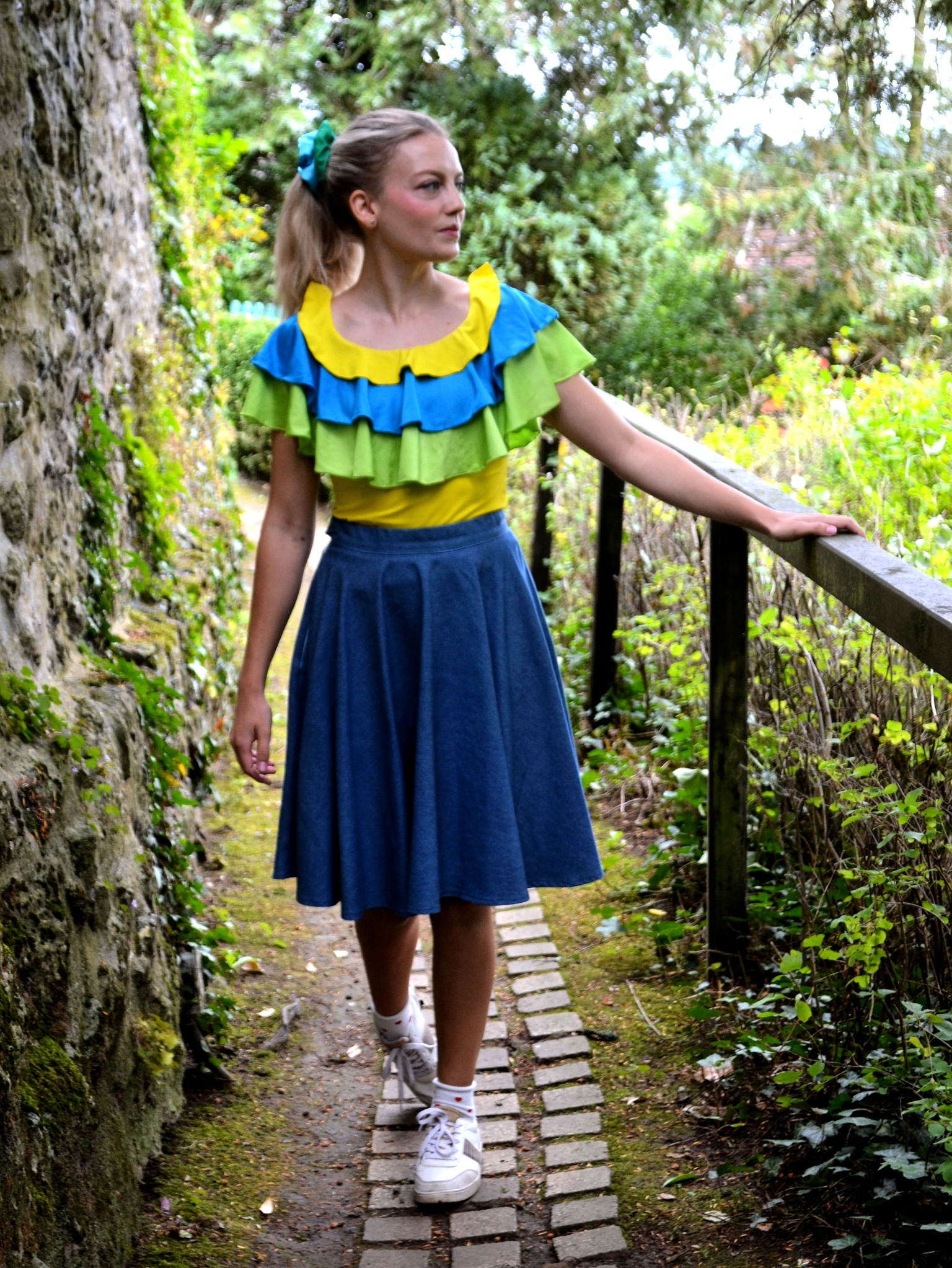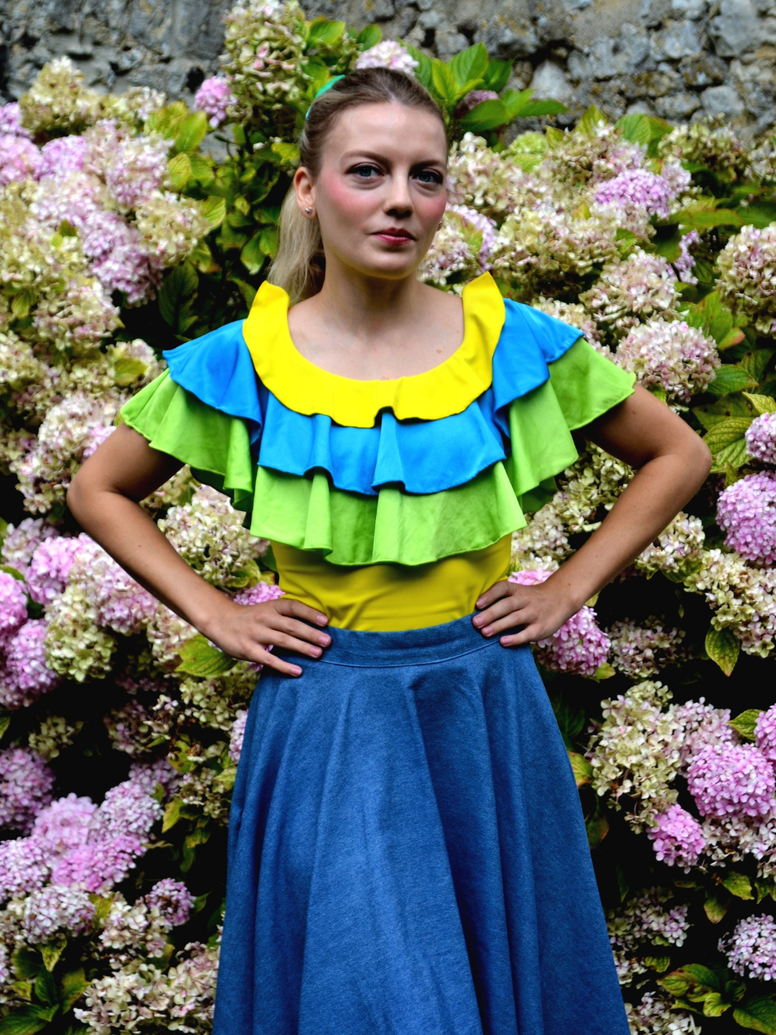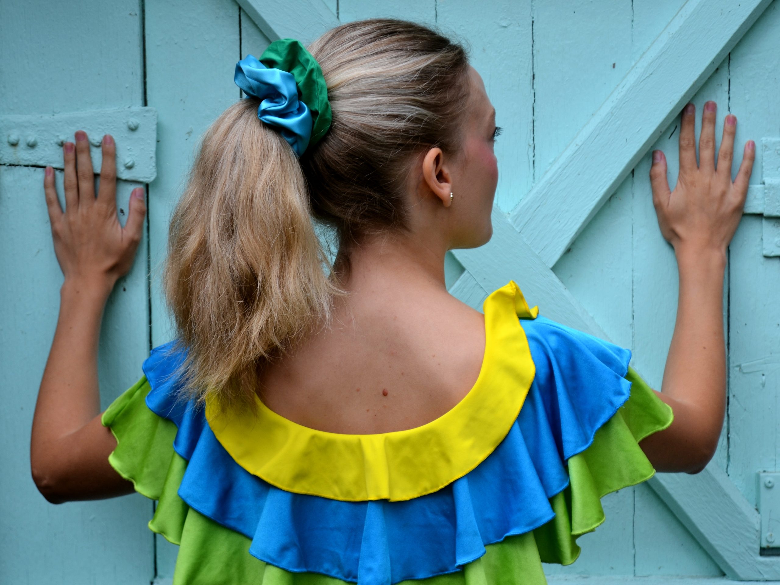 Haut pour femme tricolore à volants jaune bleu et vert