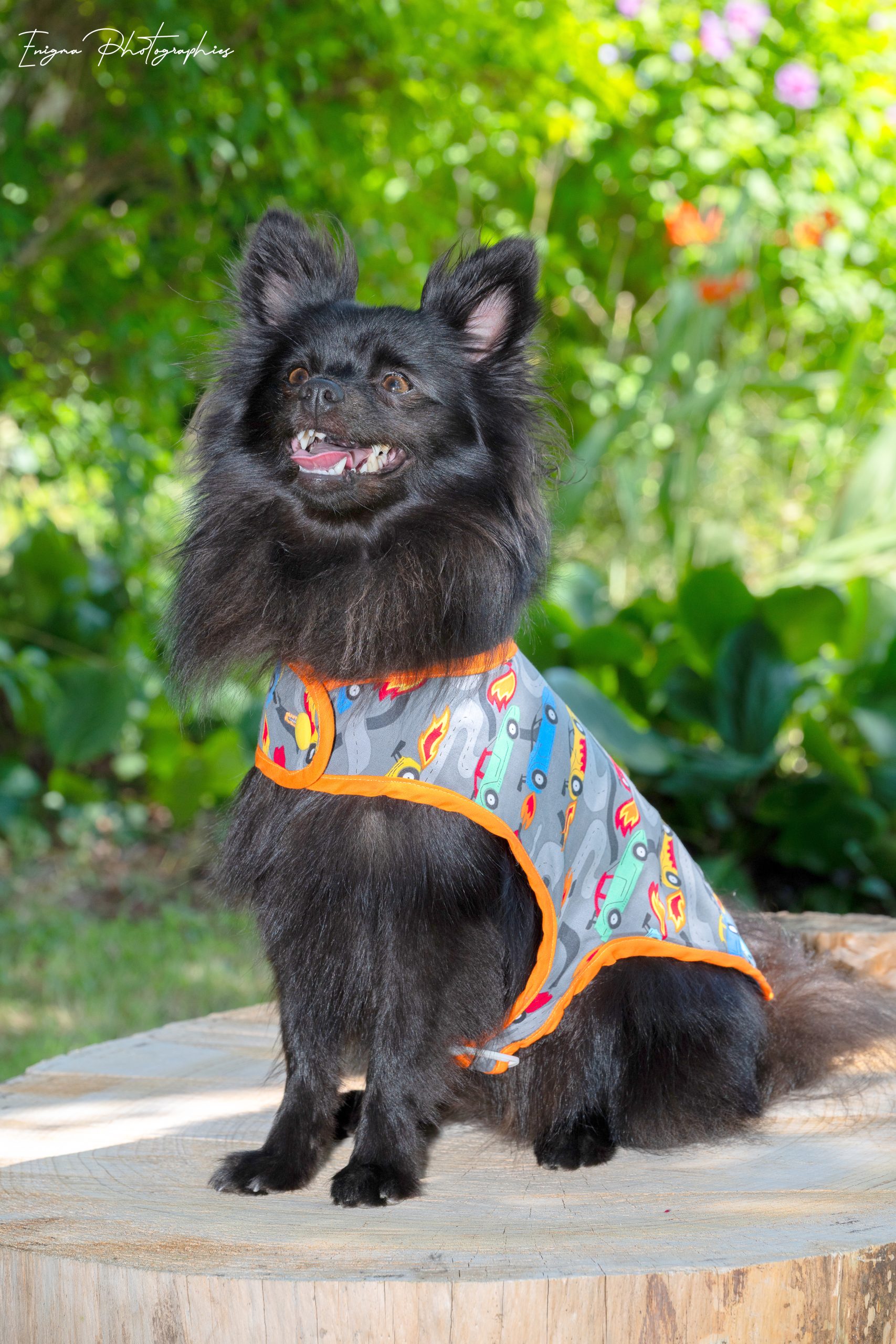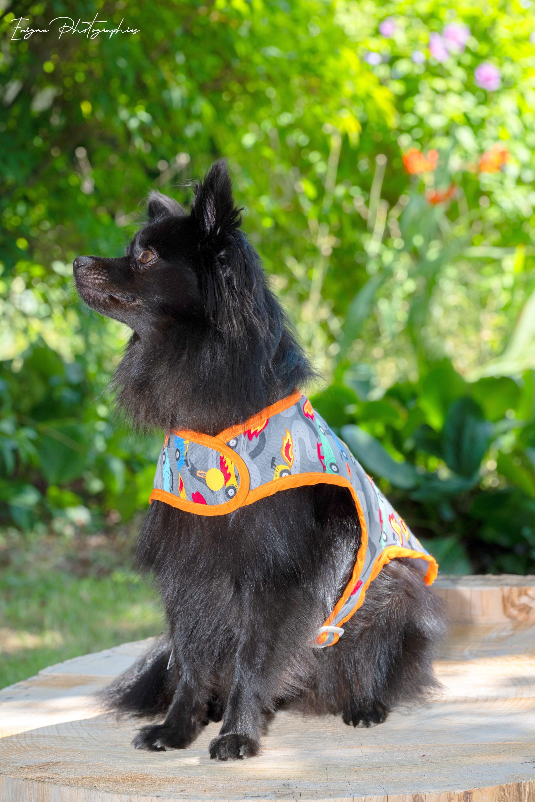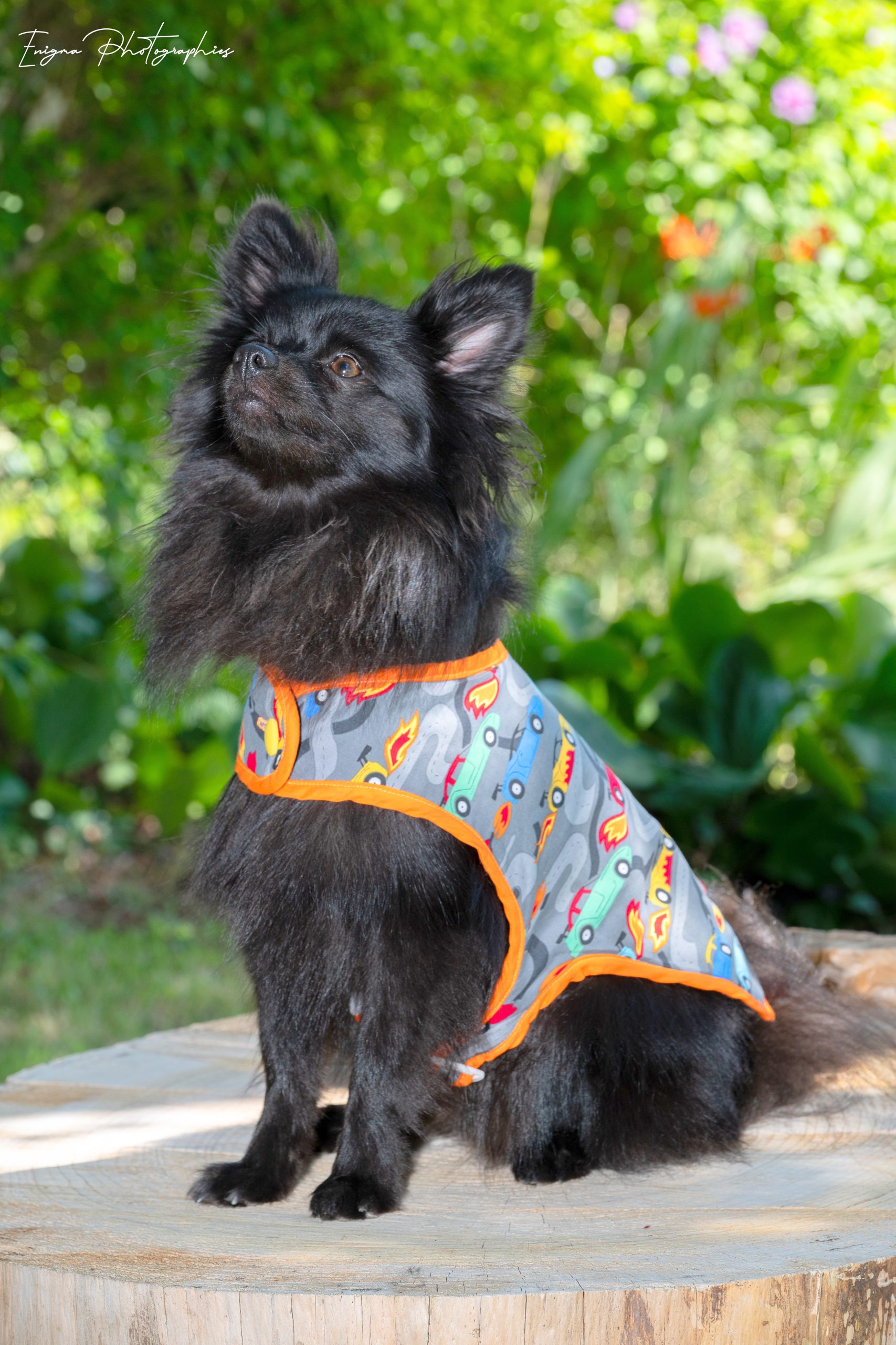 Un manteau pour chien en coton imprimé voitures et biais orange : un look audacieux dans cette pièce unique