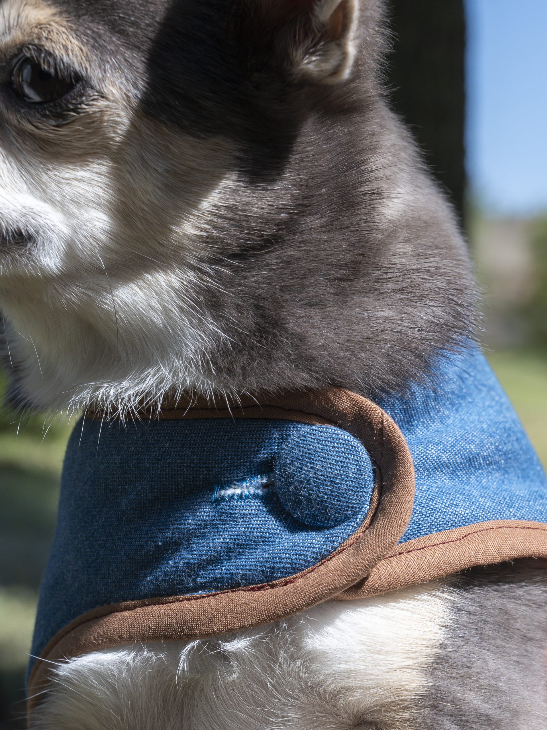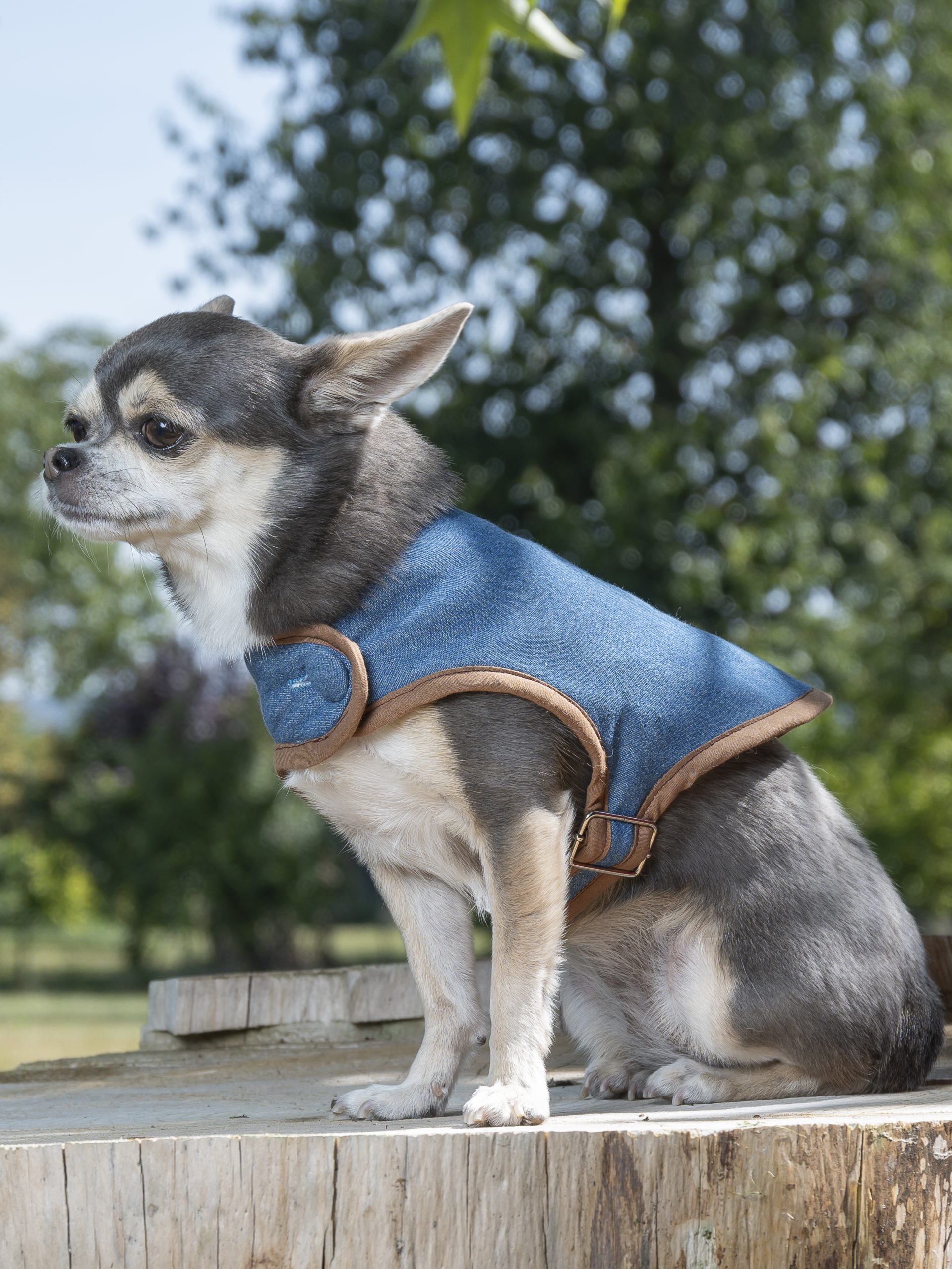Un manteau pour chien Made in France en jean bleu uni et biais marron