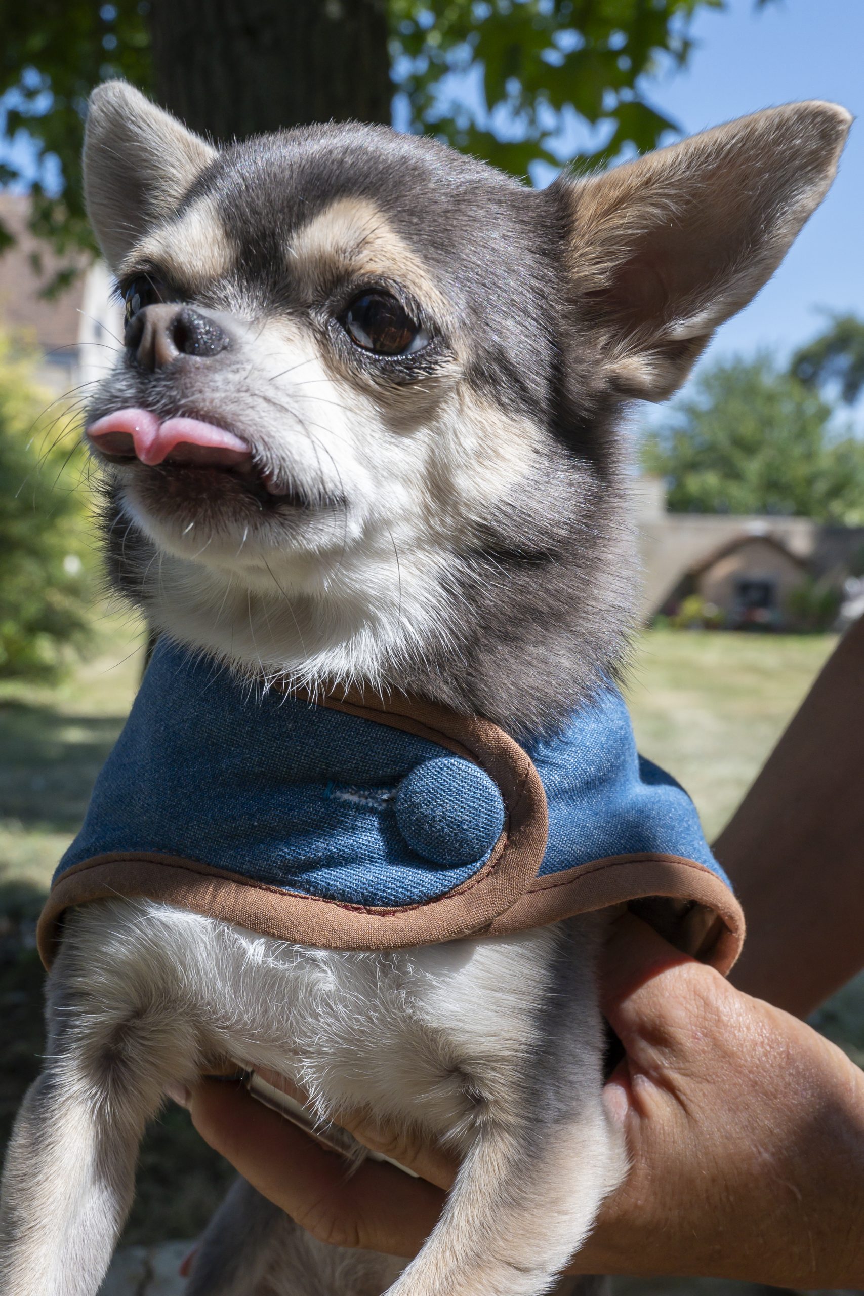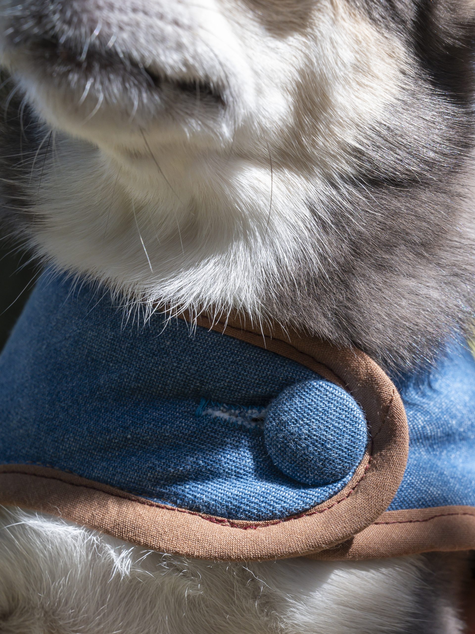 Ce manteau est l’accessoire idéal pour les chiens qui aiment se faire remarquer avec style. Nous l’avons confectionné dans un jean bleu uni. Les bords sont soulignés par un biais de coton marron clair, qui met en valeur la silhouette du manteau. Sur le poitrail, un large bouton recouvert assorti vient compléter le look. Le manteau s’enfile facilement grâce à une boucle banane.