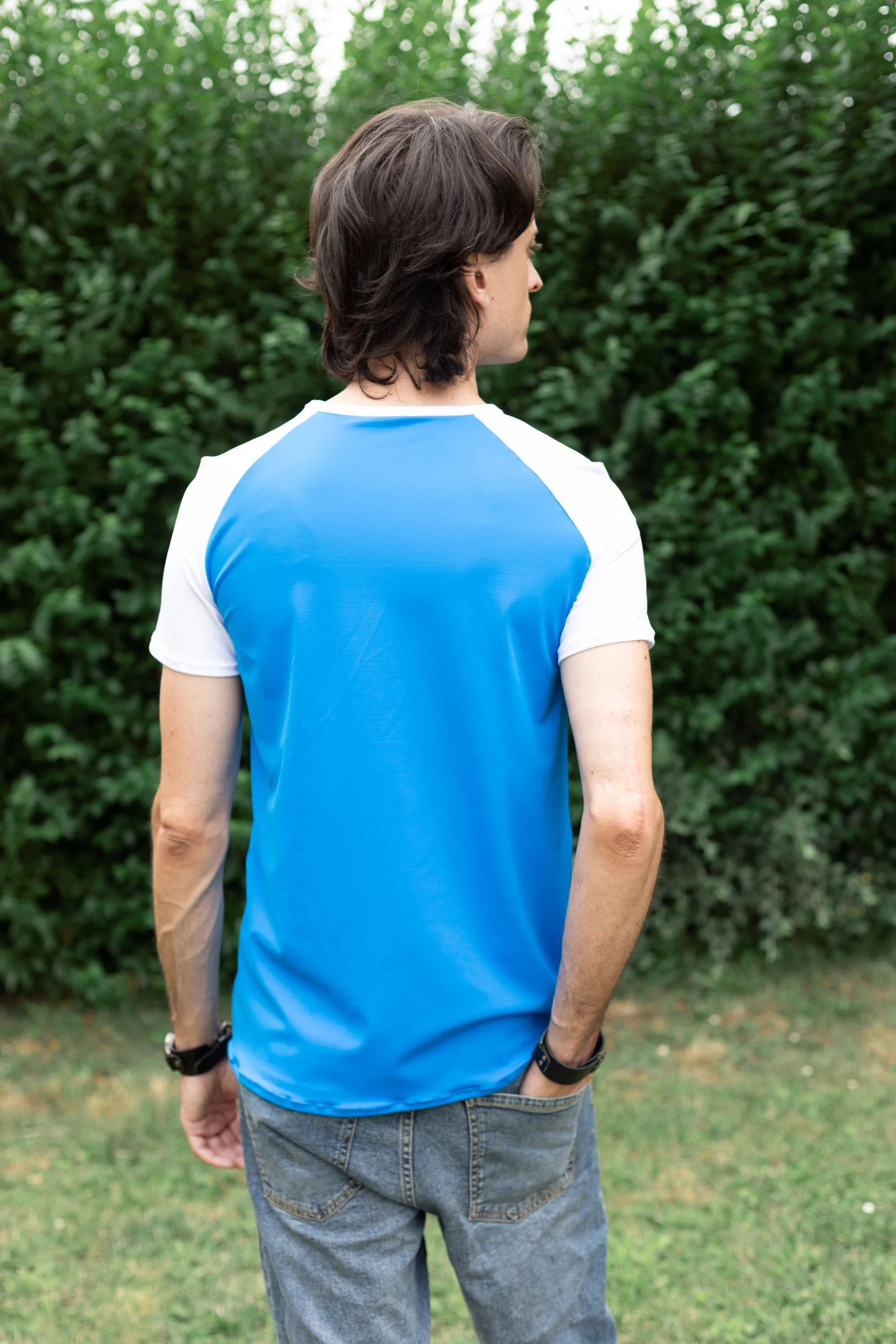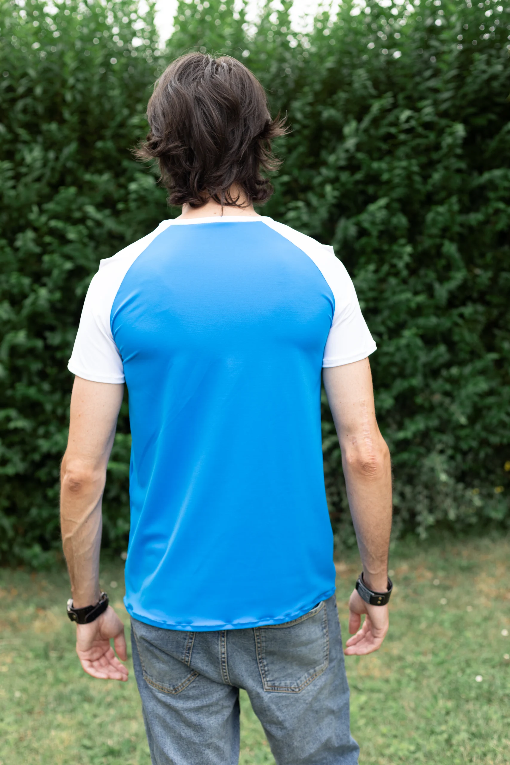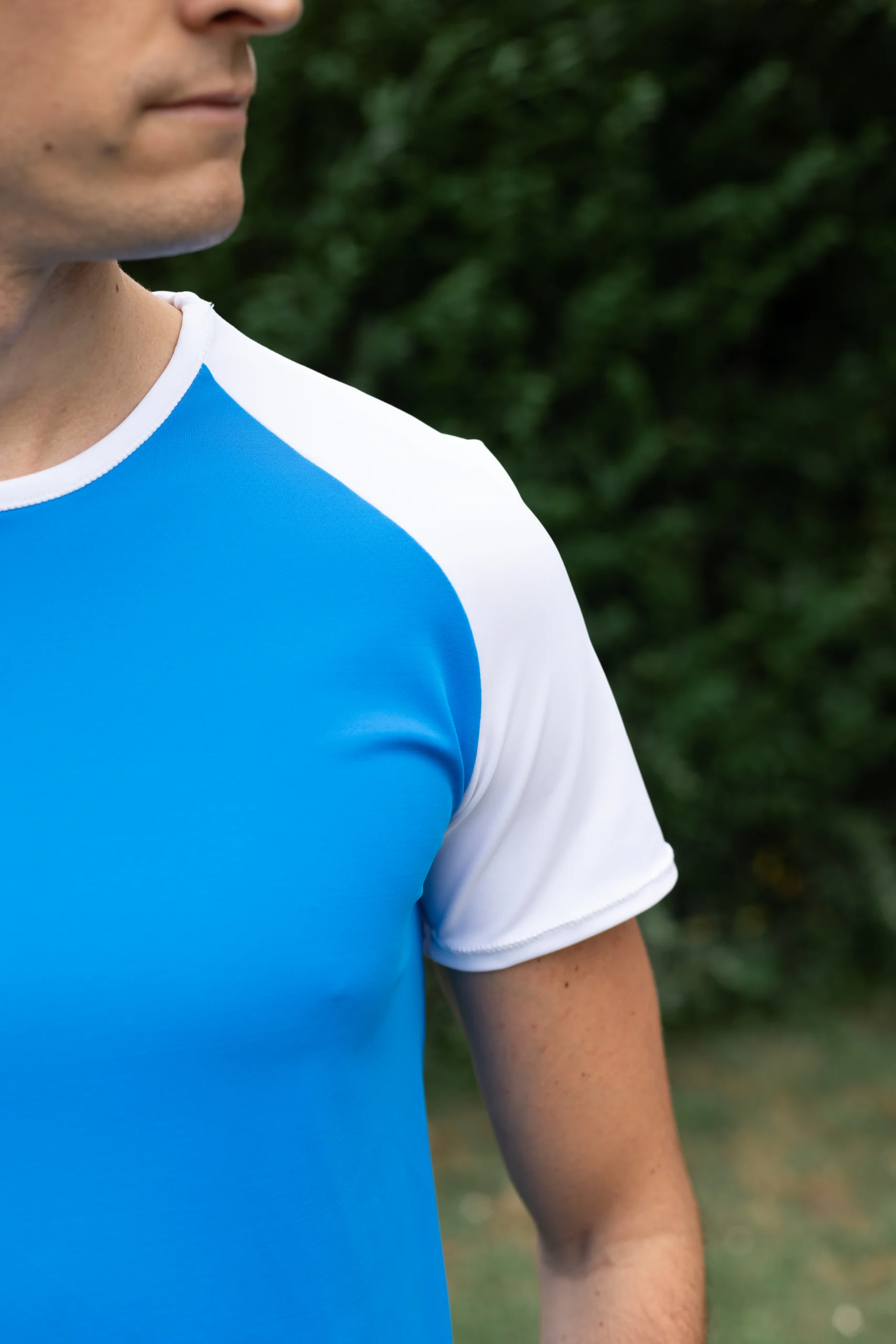 Tee-shirt homme de belle qualité, en polyamide/élasthanne bleu et blanc (repassage superflu, entretien facile !), à encolure ronde et manches courtes façon raglan. Un basique incontournable de la garde-robe masculine et idéal pour le sport!