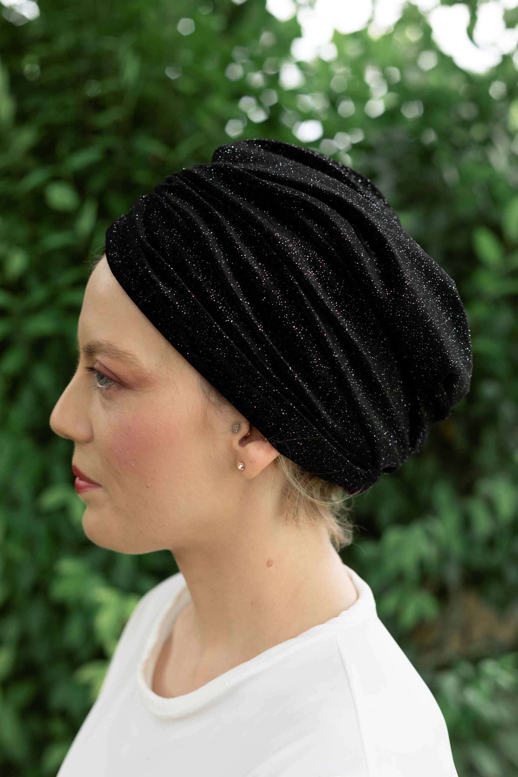 Ce turban est un accessoire envoûtant. Son velours noir profond est somptueux. Il est constellé de paillettes argentées scintillantes. Il offre un éclat mystérieux et chic. Sa doublure intérieure est en jersey de coton. Elle est très douce et respirante. Elle est parfaite pour les cuirs chevelus sensibles. Il assure un maintien parfait. Il apporte une touche de glamour subtile et nocturne.