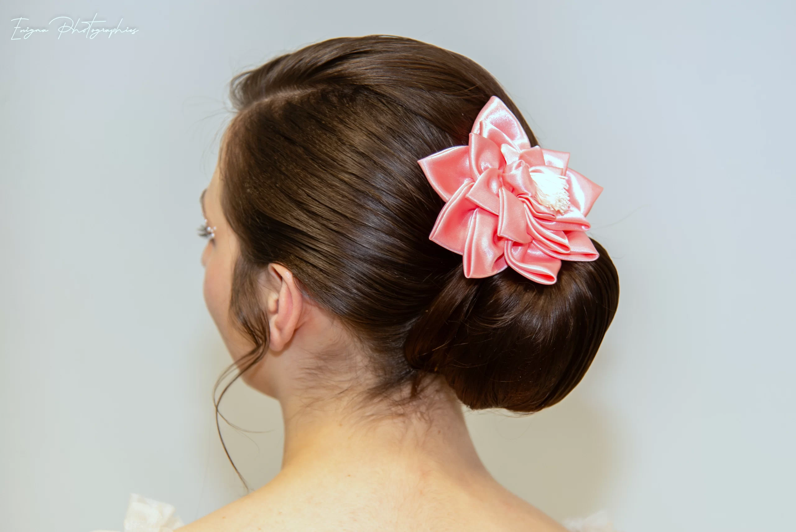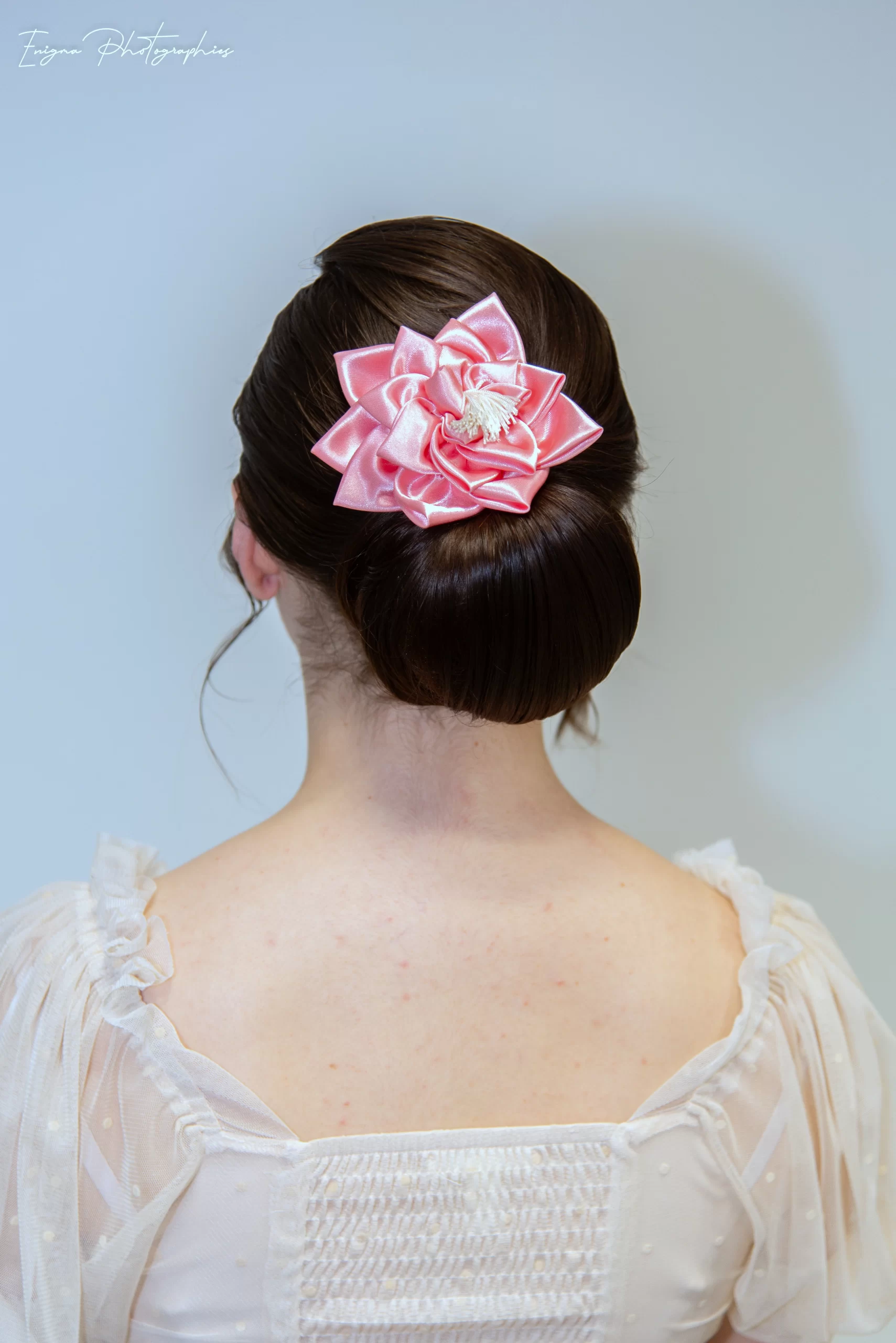 Pink satin “Water Lily” hair accessory for Haute Couture hair