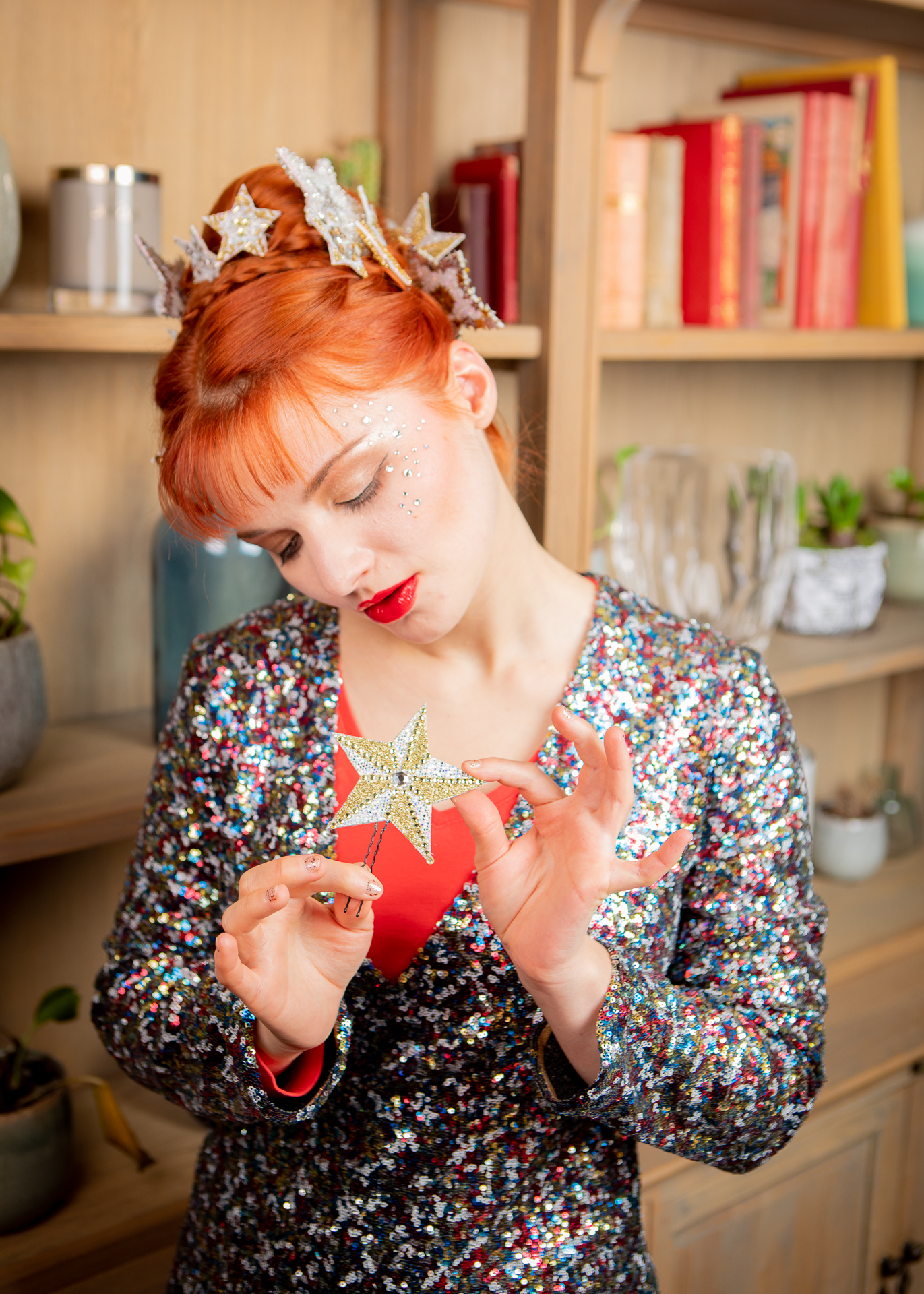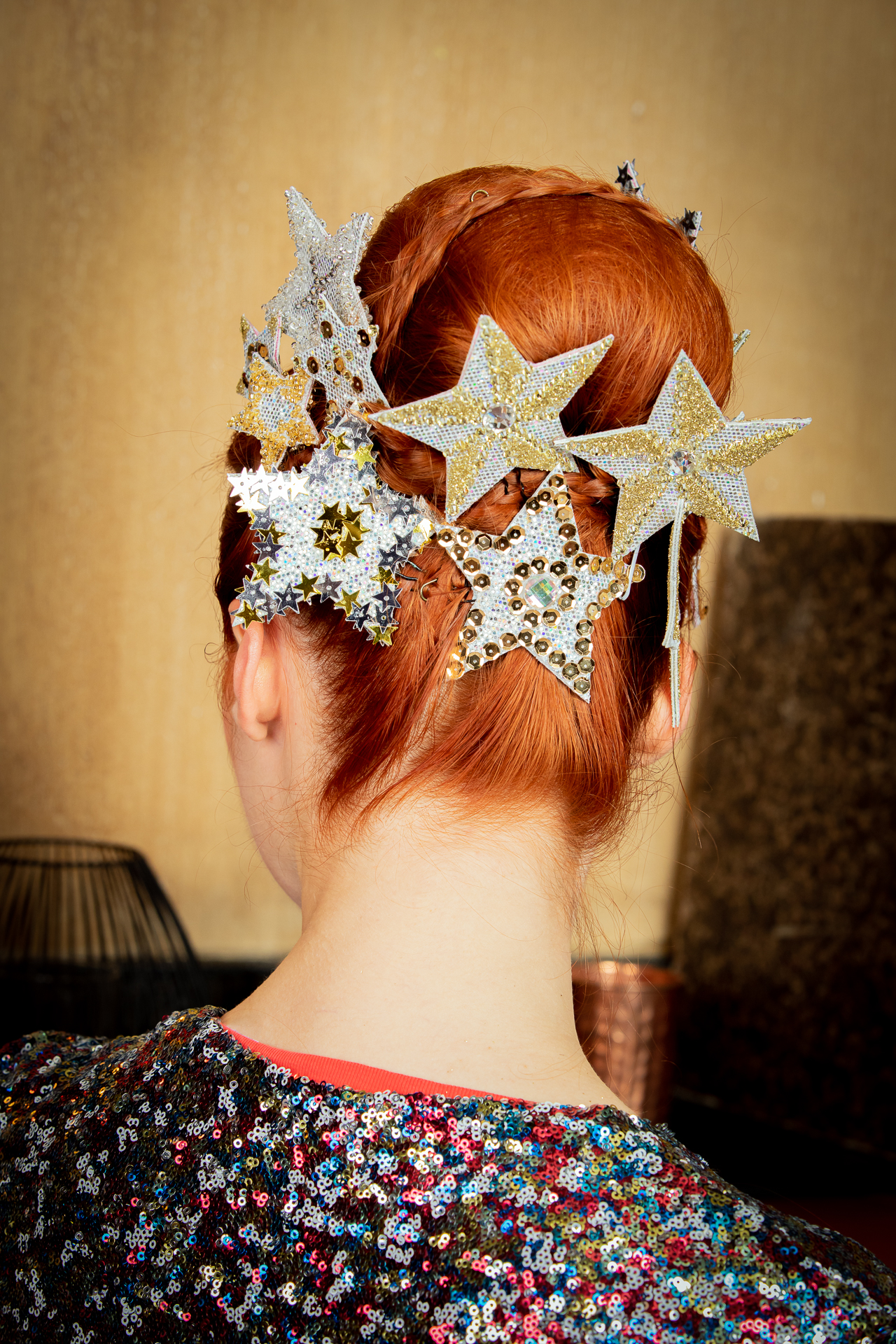 Hair accessory in silver brocade hologram and golden glitter: “Etoile du Berger” (“Shepherd’s Star”)