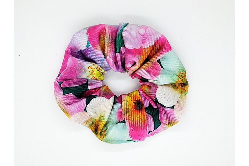 Elasticated hair scrunchie in pink flowered lycra, entirely hand-made. Diameter: about 8 cm. Pay homage to spring with this pretty flowered hair scrunchie!