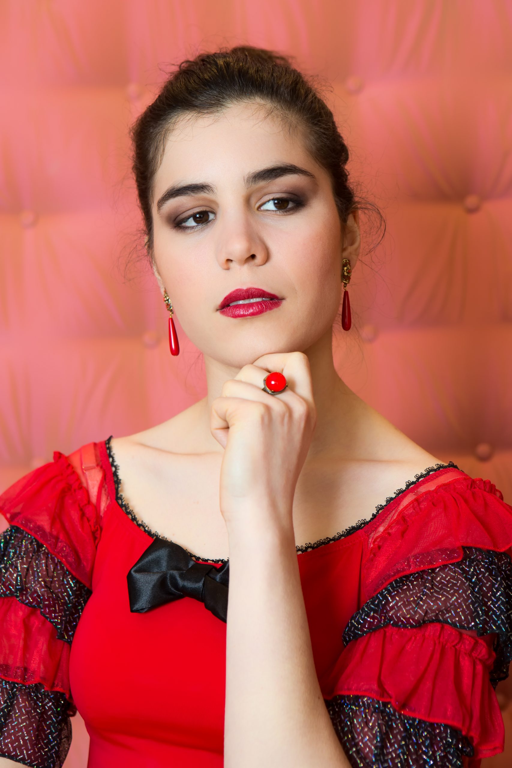 This baroque-inspired women’s top is made of beautiful red plain polyamide/elastane knit. This top has a dancer neckline and a charming little black polyester satin bow in the middle front. The sleeves are made in red lamé and black glittery polyamide/elastane mesh, and are decorated with multiple small hand gathered ruffles.
