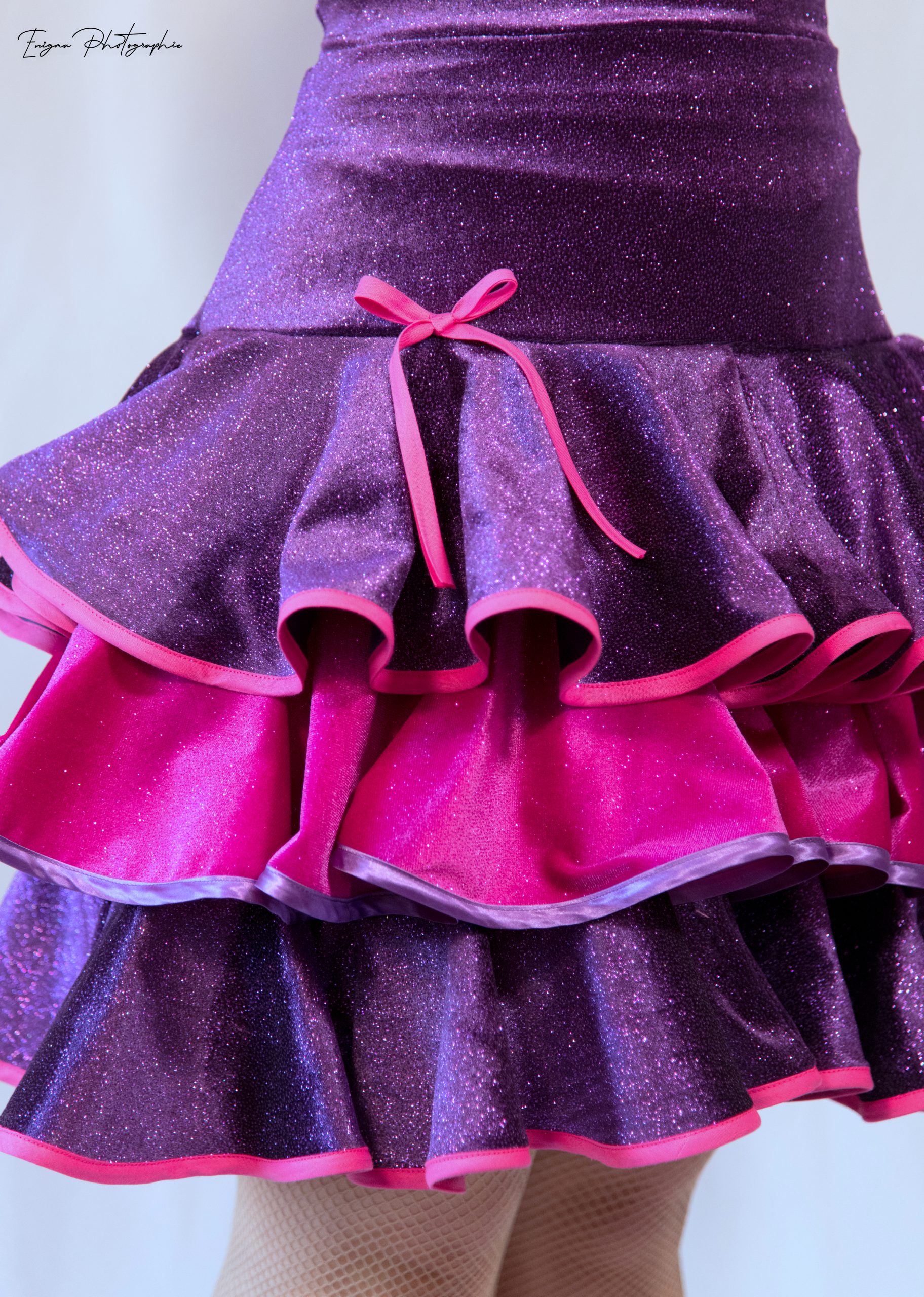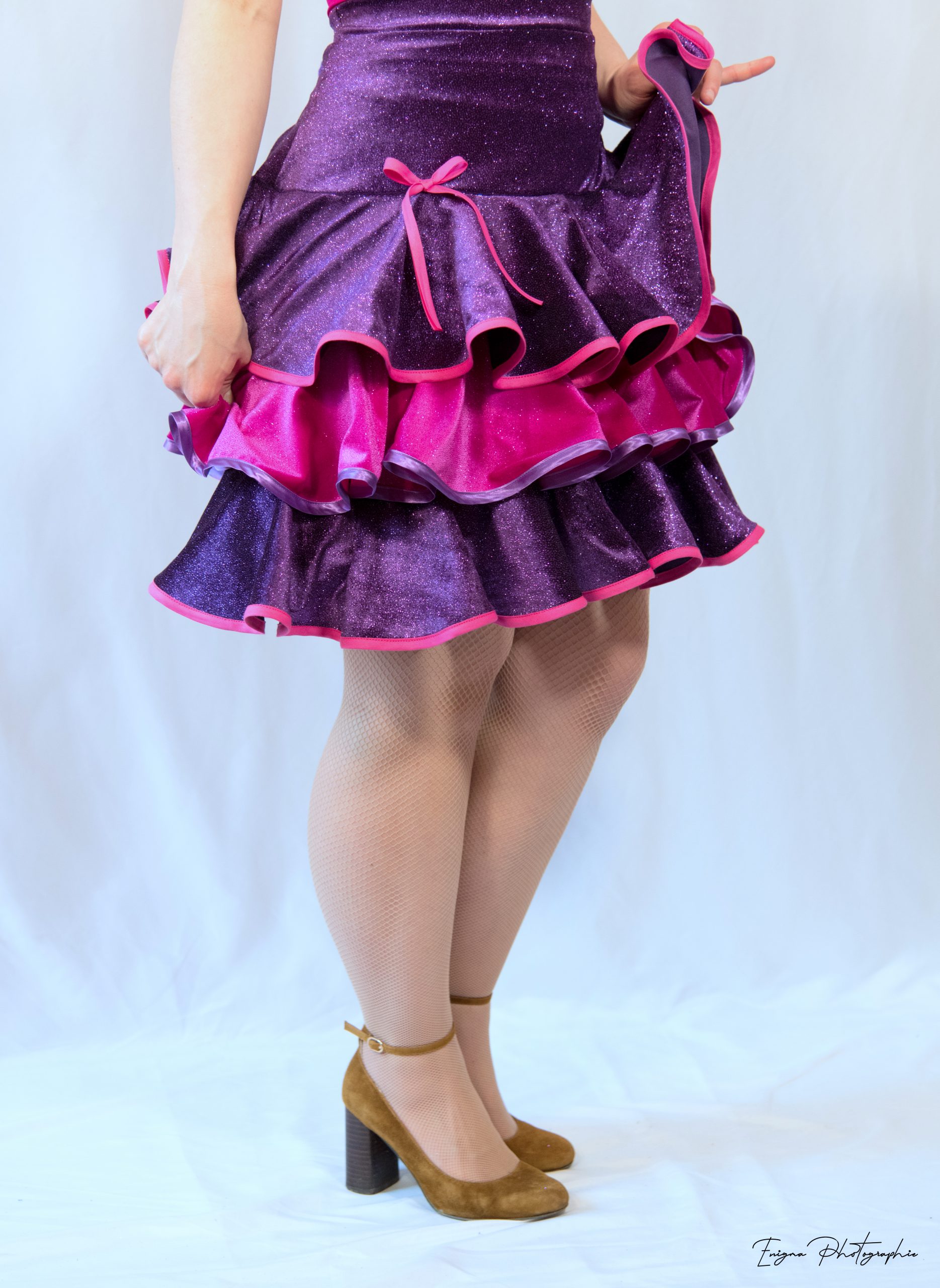 A love of skirt ! Cucaracha is a purple velvet skirt with purple yoke, and three circle ruffles: two purple and one fuchsia, adorned with contrasting satin bias, with a small fuchsia bow at the base of the yoke on one side. The waist is elasticated to ensure perfect comfort. Length 52cm approximately.
