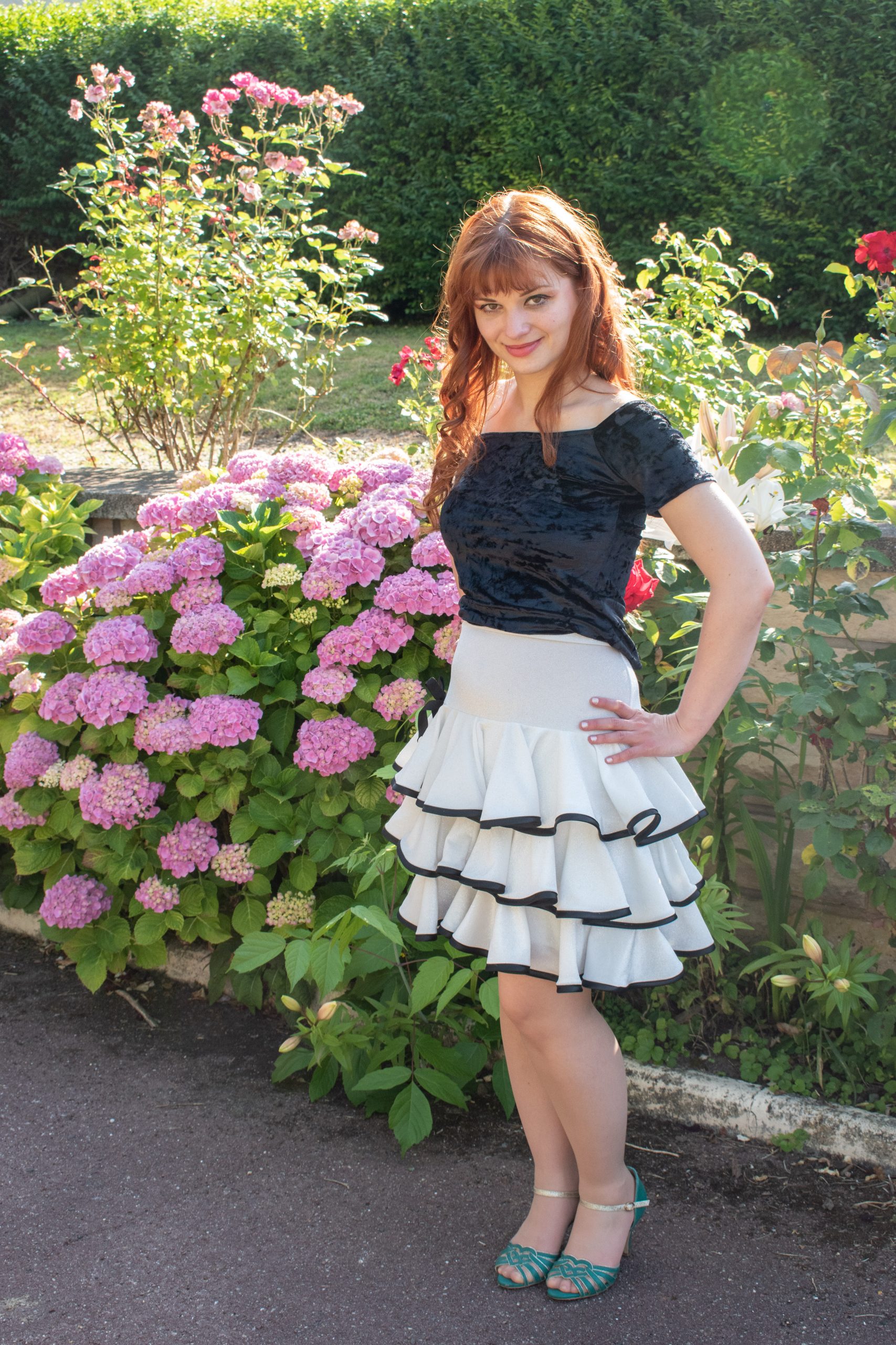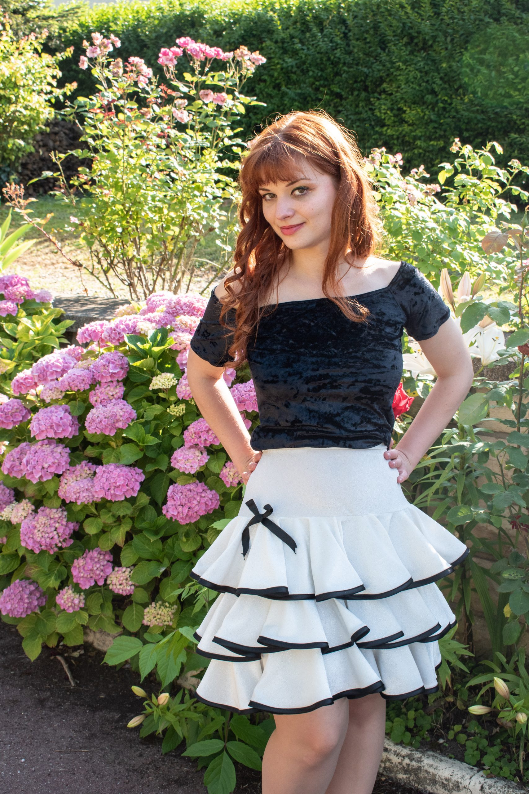 A love of skirt! Cucaracha is a white velvet skirt with yoke, and three circle ruffles decorated with contrasting black bias, with a small black bow at the base of the yoke on one side. The waist is elasticated to ensure a perfect comfort. Length 52cm approximately.