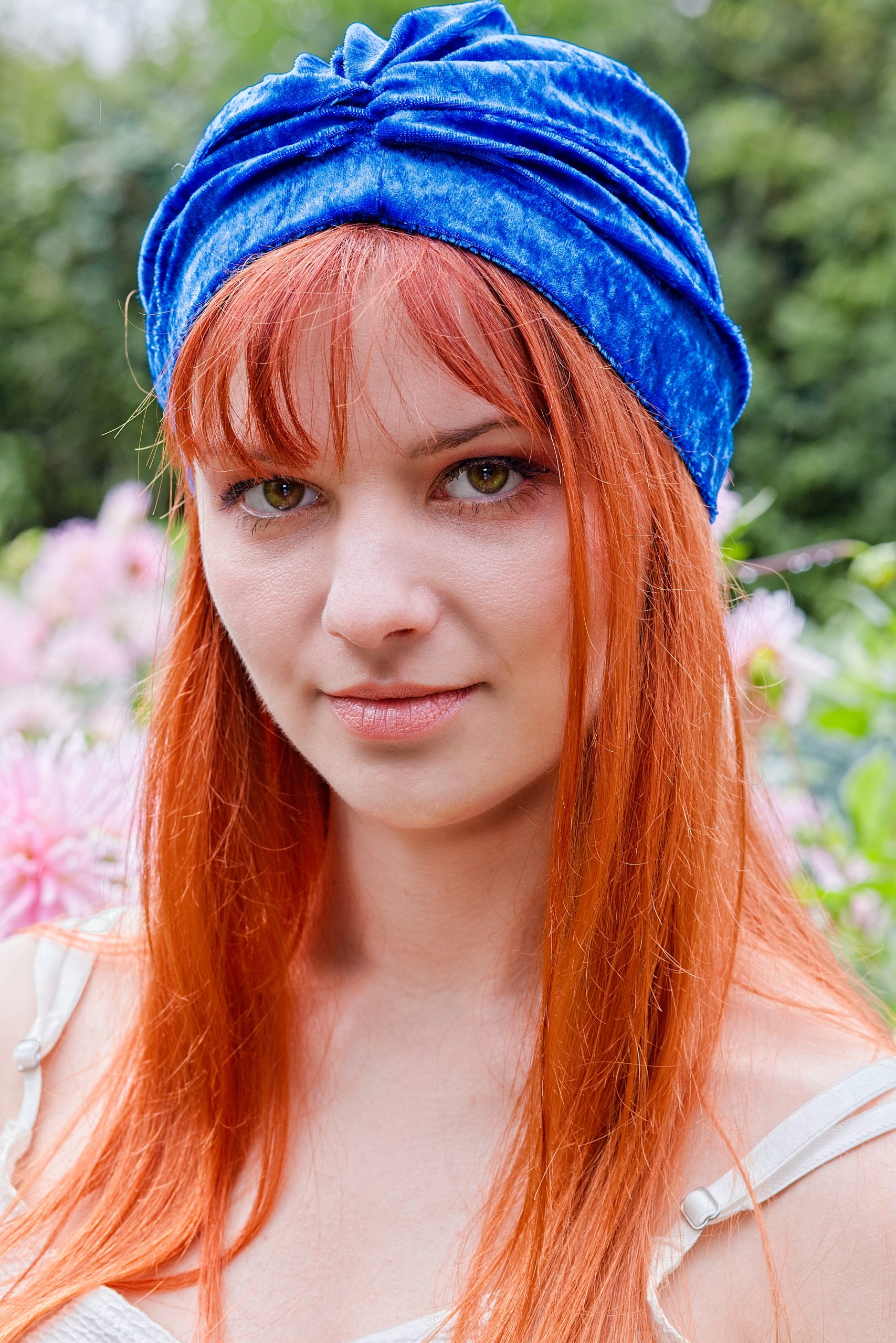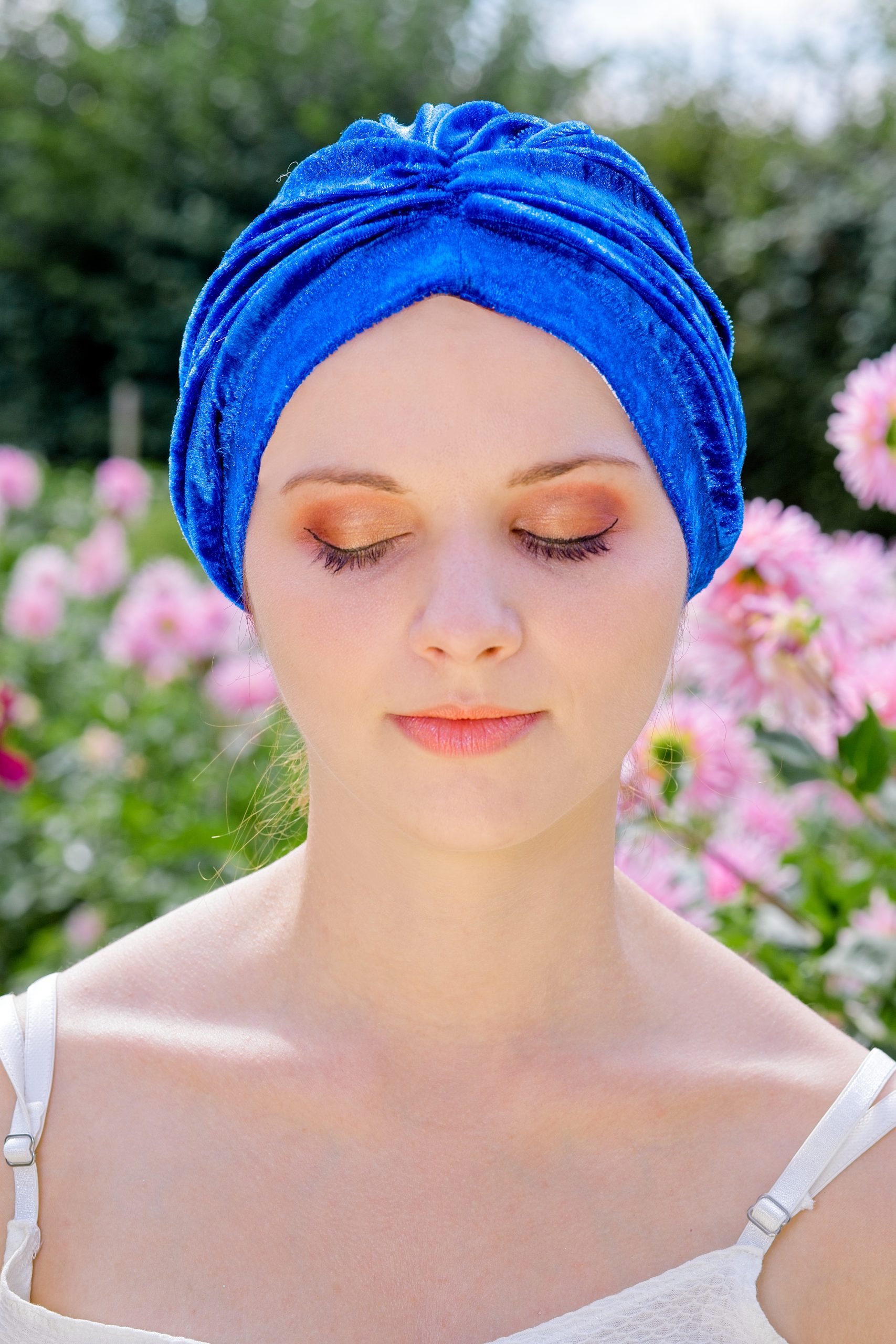 This pretty plain blue velvet woman’s turban will be the perfect ally for all women losing their hair after chemo ! Its print will give you a daily style to keep you looking good despite cancer. Entirely made in France, our Sultane turban can also be worn as a simple fashion accessory by healthy people to give a vintage touch to your outfit.